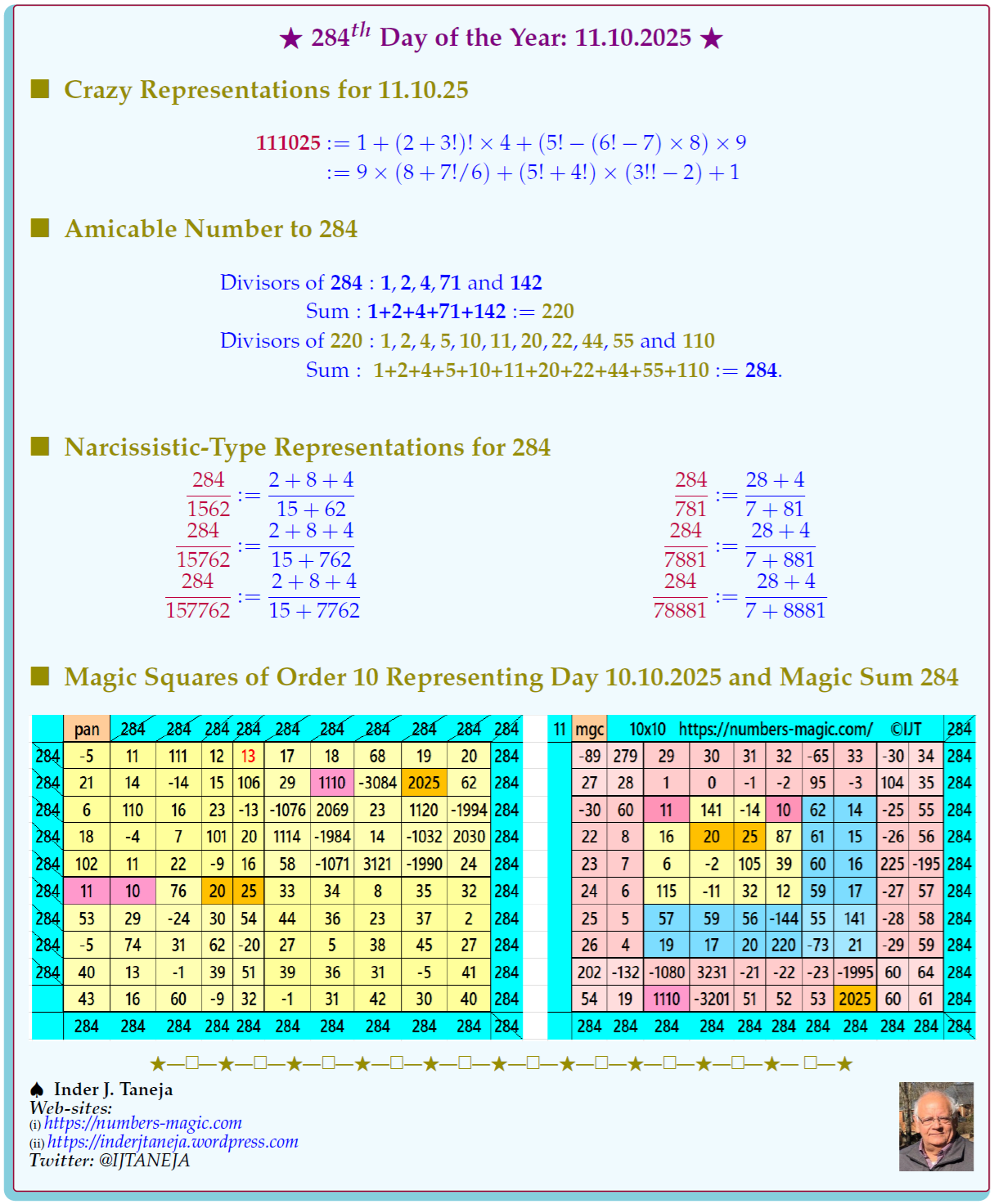 284th Day of the Year – 11.10.2025: Crazy Representations and Magic Squares of Order 10