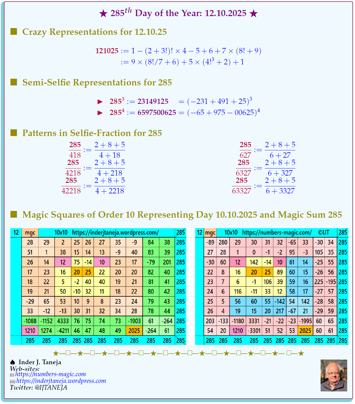 285th Day of the Year – 12.10.2025: Crazy Representations and Magic Squares of Order 10