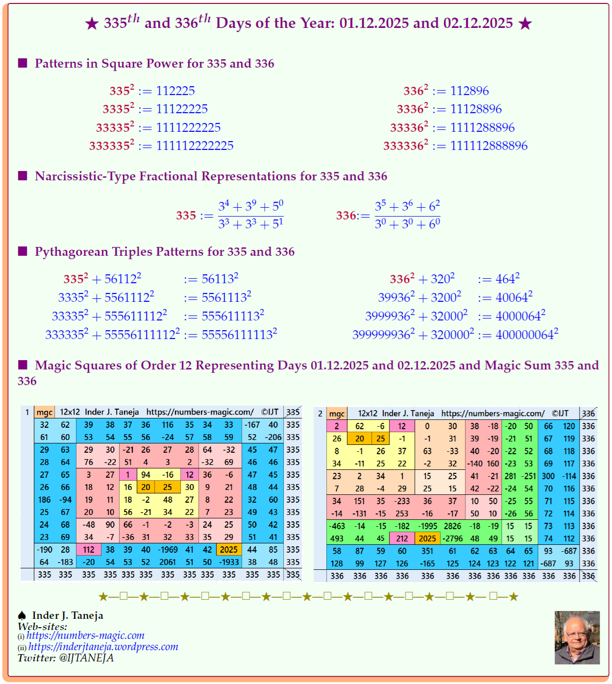 335th and 336th Days of the Year – 01.12.2025 and 02.12.2025: Magic Squares of Order 12 and Crazy Representations