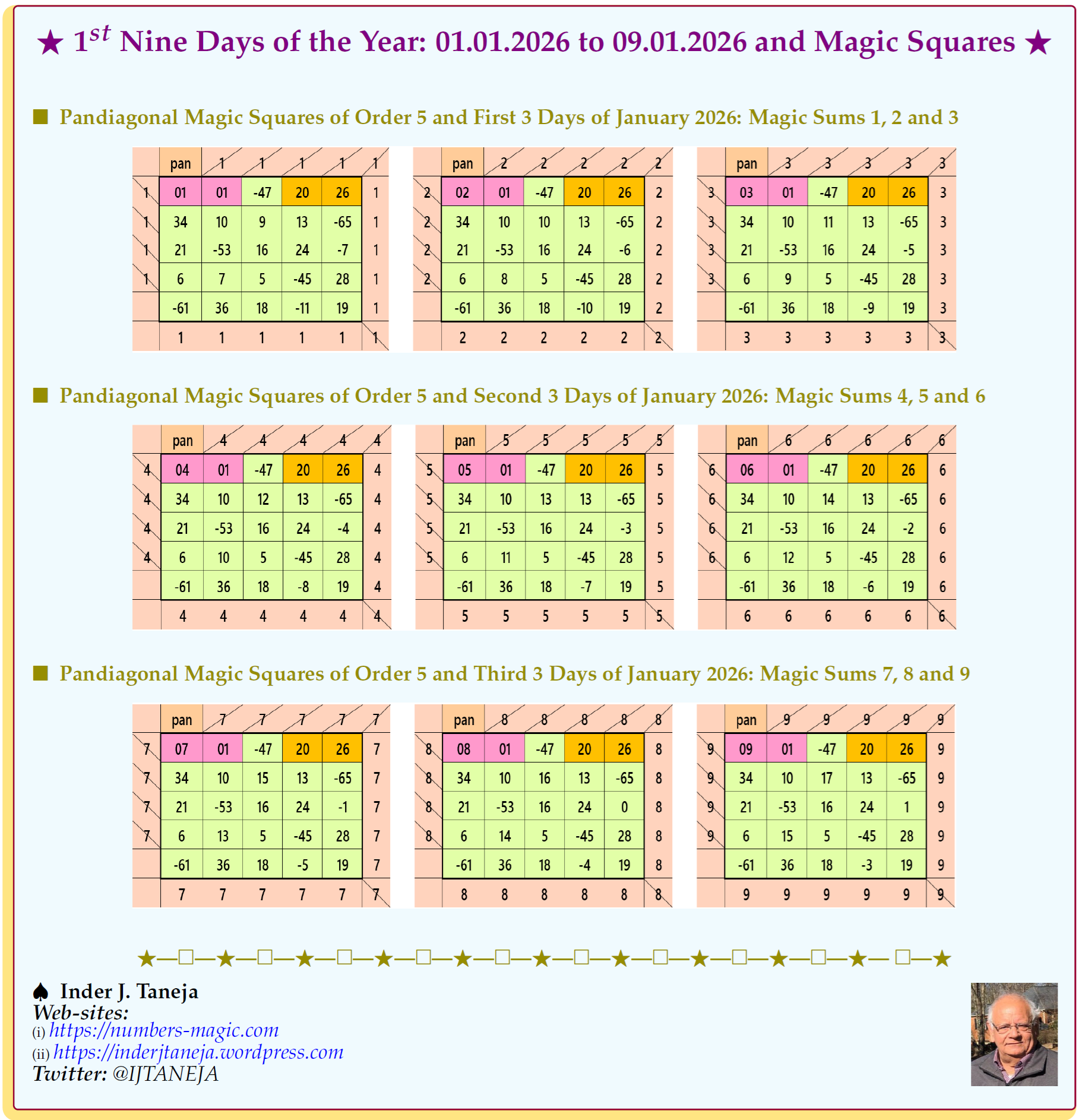 Days of Year The First Nine Days of the Year (01.01.2026–09.01.2026) and Pandiagonal Magic Squares of Order 5 January 8, 2026 Inder J. Taneja References Part 1: Representing Days and Date Part 2: Revised with Examples
