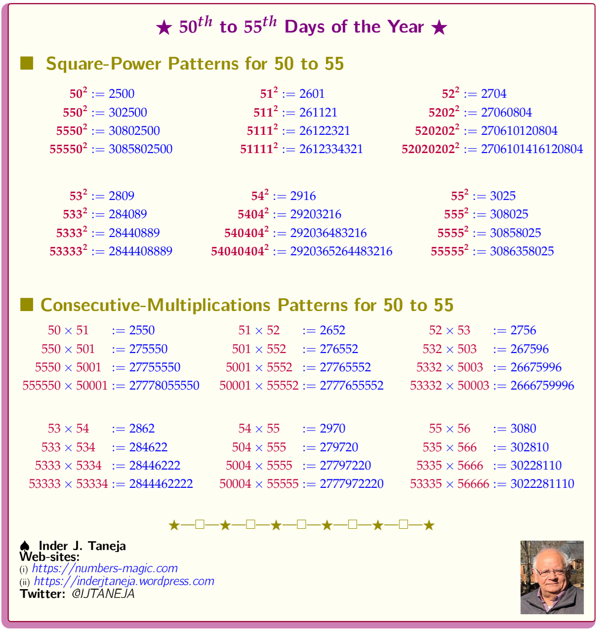 50th to 55th Days of the Year: Patterns in Square-Power and Consecutive Multiplications