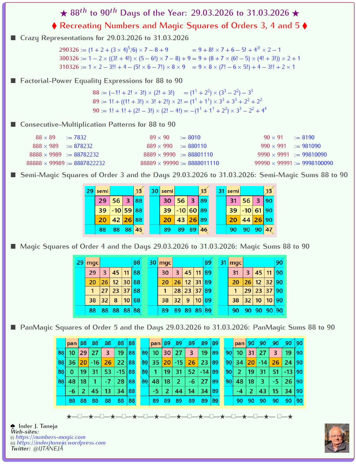 88th to 90th Days of the Year: 29.09.26 to 31.03.26 – Recreating Numbers, Patterns and Magic Squares of Orders 3, 4 and 5