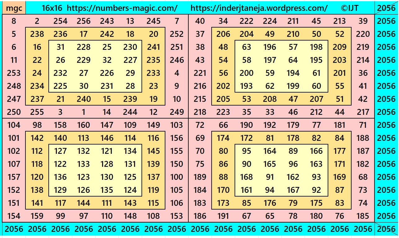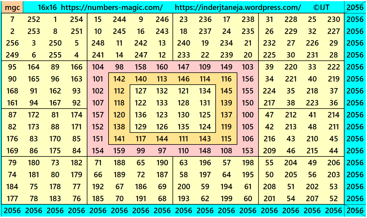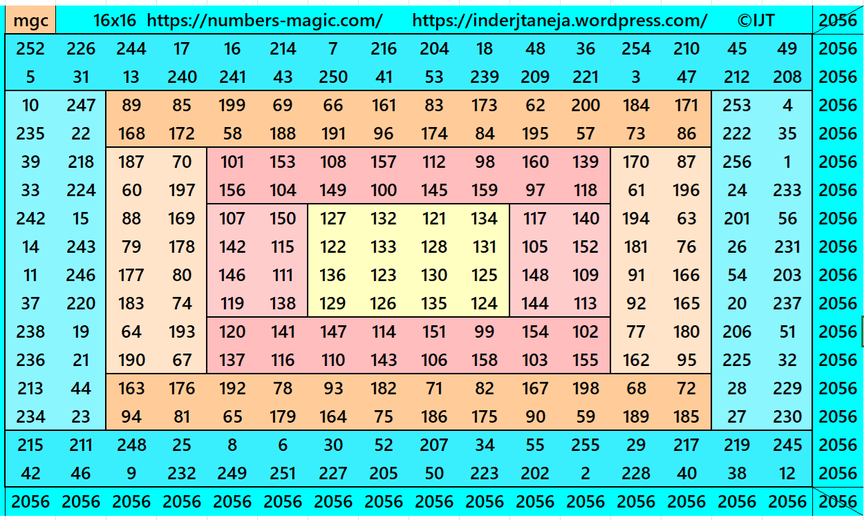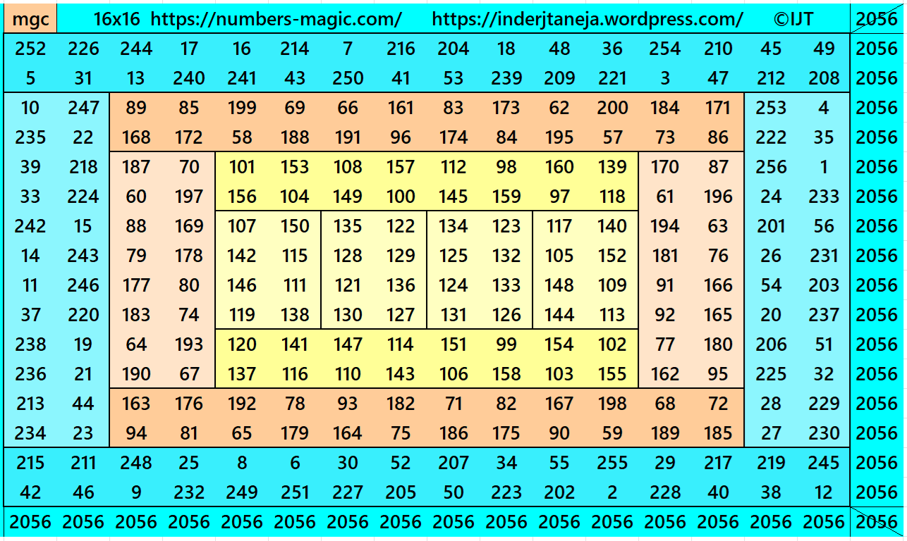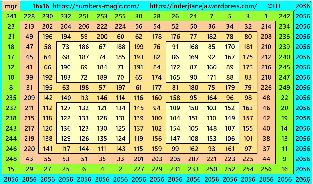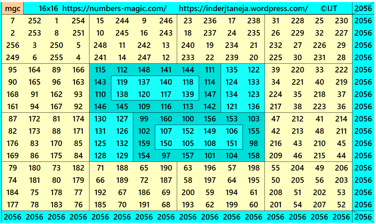 It is a also double-digit bordered magic square of order 16 written in little different way. Here we don’t have block of order 2×2 as in the previous example. Removing the higher borders still we are left with magic squares of lower orders, such as of orders 12, 8 and 4. The internal block is a pandiagonal magic square of order 4.