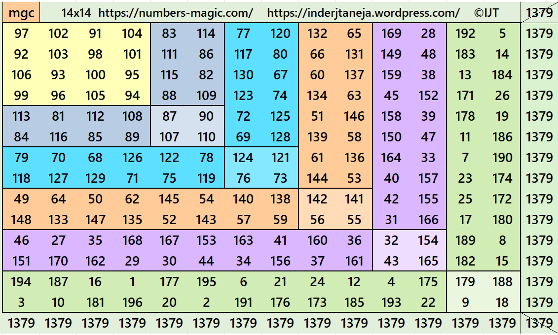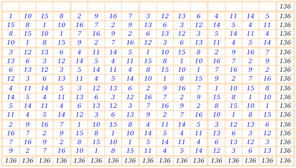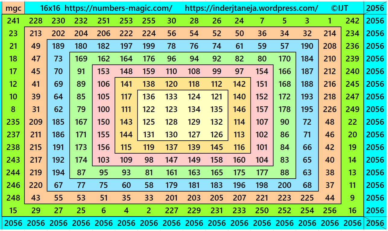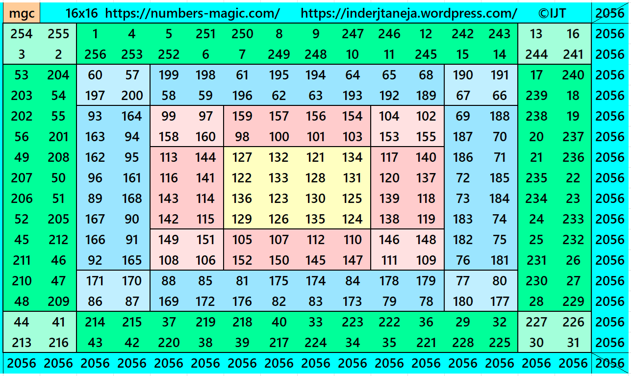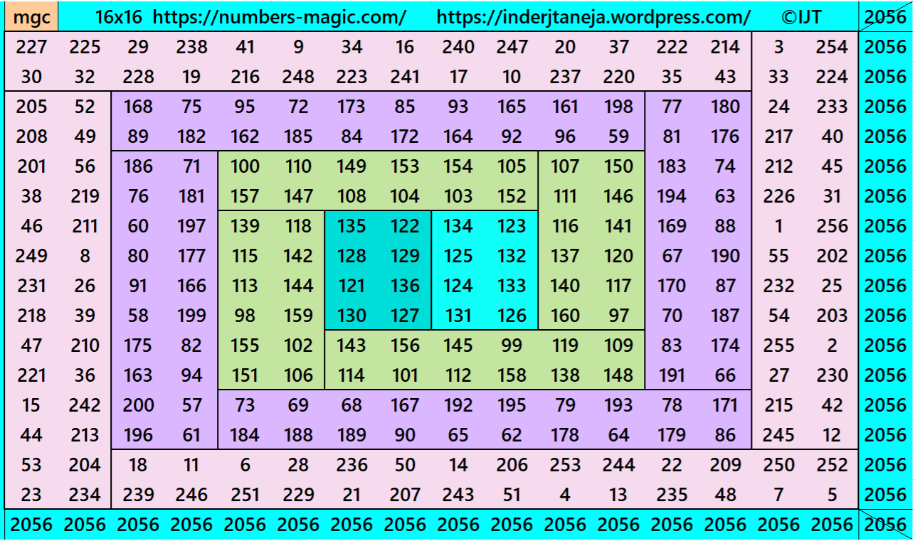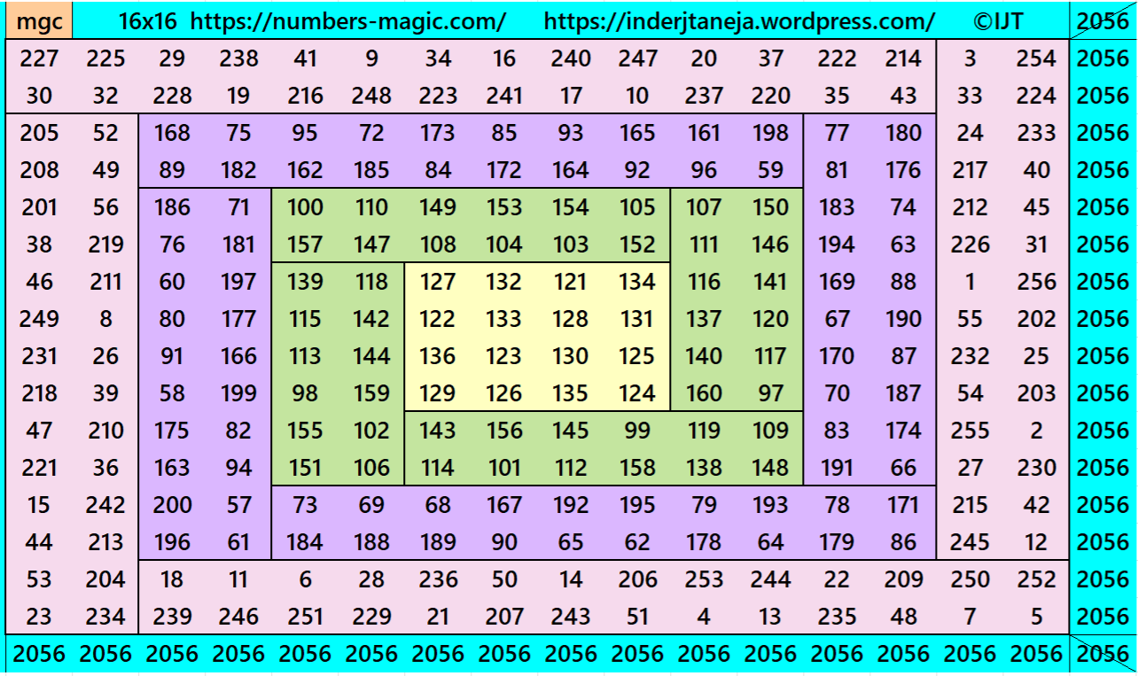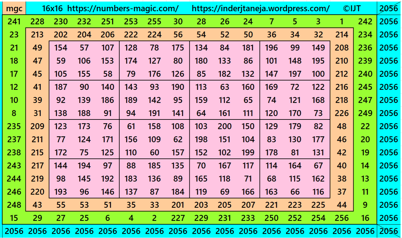 It is a also double-digit bordered magic square of order 16 written in little different way. Here we don’t have block of order 2×2 as in the previous example. Removing the higher borders still we are left with magic squares of lower orders, such as of orders 12, 8 and 4. The internal block is a pandiagonal magic square of order 4.
