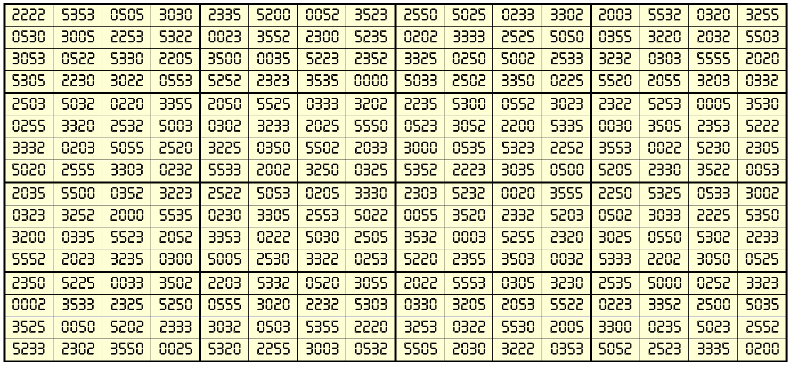 The above magic square is water reflexive with equal magic sums. The blocks of order 4 are magic squares with equal magic sums. It is bimagic. The magic sums are S16×16(0, 2, 3, 5) := 44440 and Sb16×16(0, 2, 3, 5) := 175957352. The blocks of order 4 are magic squares with equal magic sums, i.e., S16×16(0, 2, 3, 5) = 11110.