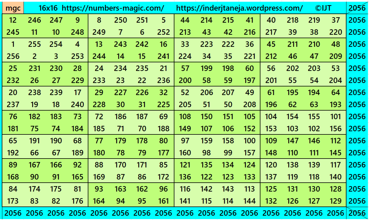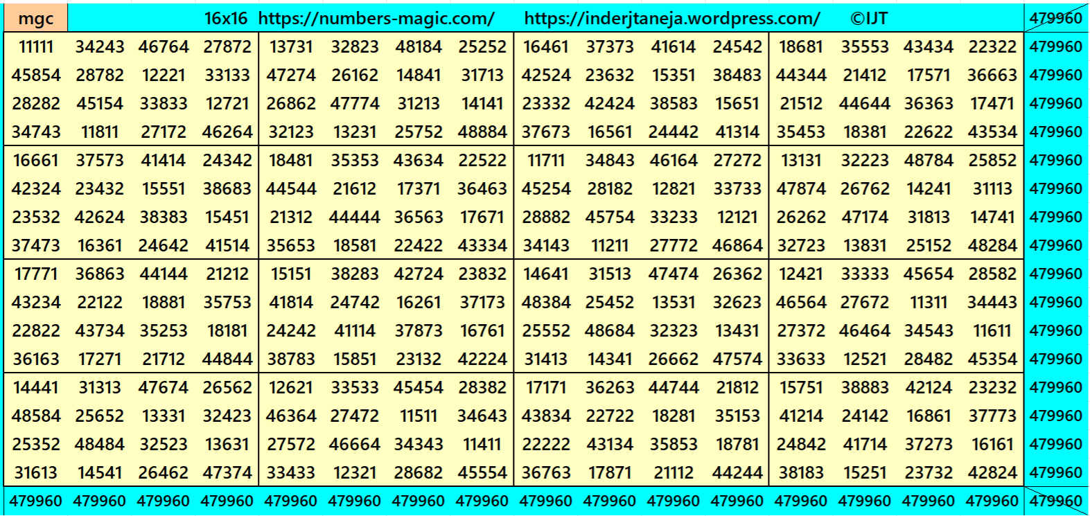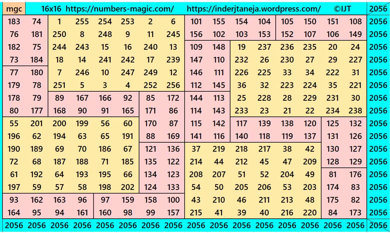 Inder J. Taneja, Different Types and Aspects of Magic Squares of Order 16, Zenodo, November 06, 2025, pp. 1-66, https://doi.org/10.5281/zenodo.17543834