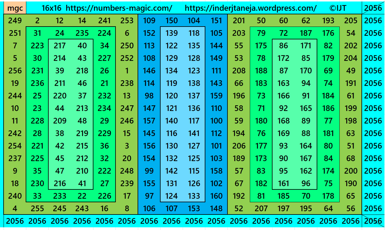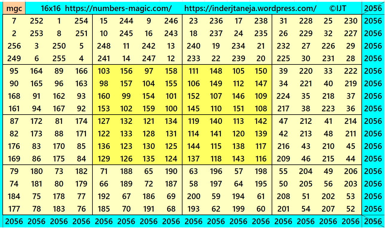 The above magic square is water reflexive with equal magic sums. The blocks of order 4 are magic squares with equal magic sums. It is bimagic. The magic sums are S16×16(1, 2, 3, 5) := 48884 and Sb16×16(1, 2, 3, 5) := 184706376. The blocks of order 4 are magic squares with equal magic sums, i.e., S4×4(1, 2, 3, 5) := 12221.