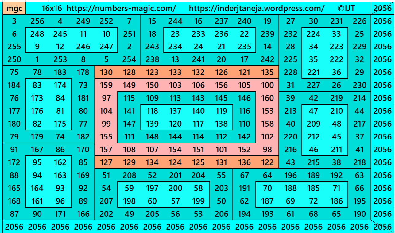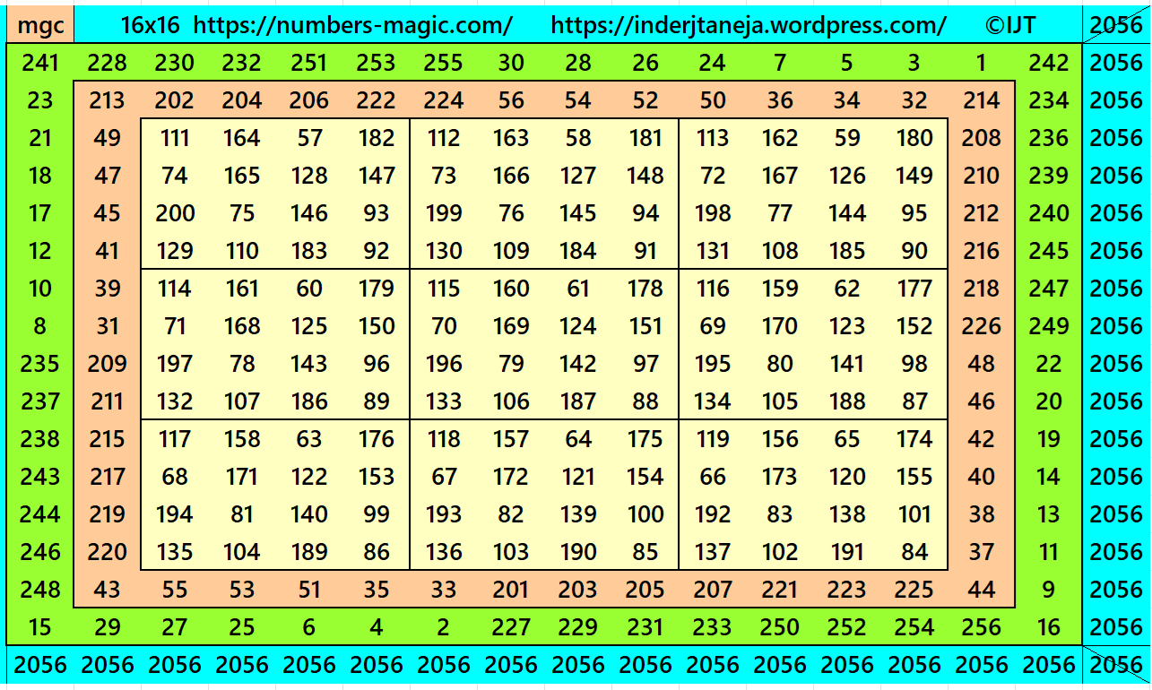 It is a also striped magic square of order 16 as it is formed by equal width and length of magic rectangles, i.e., 2×4. For more study on striped magic square of order 16 refer the author’s following work: