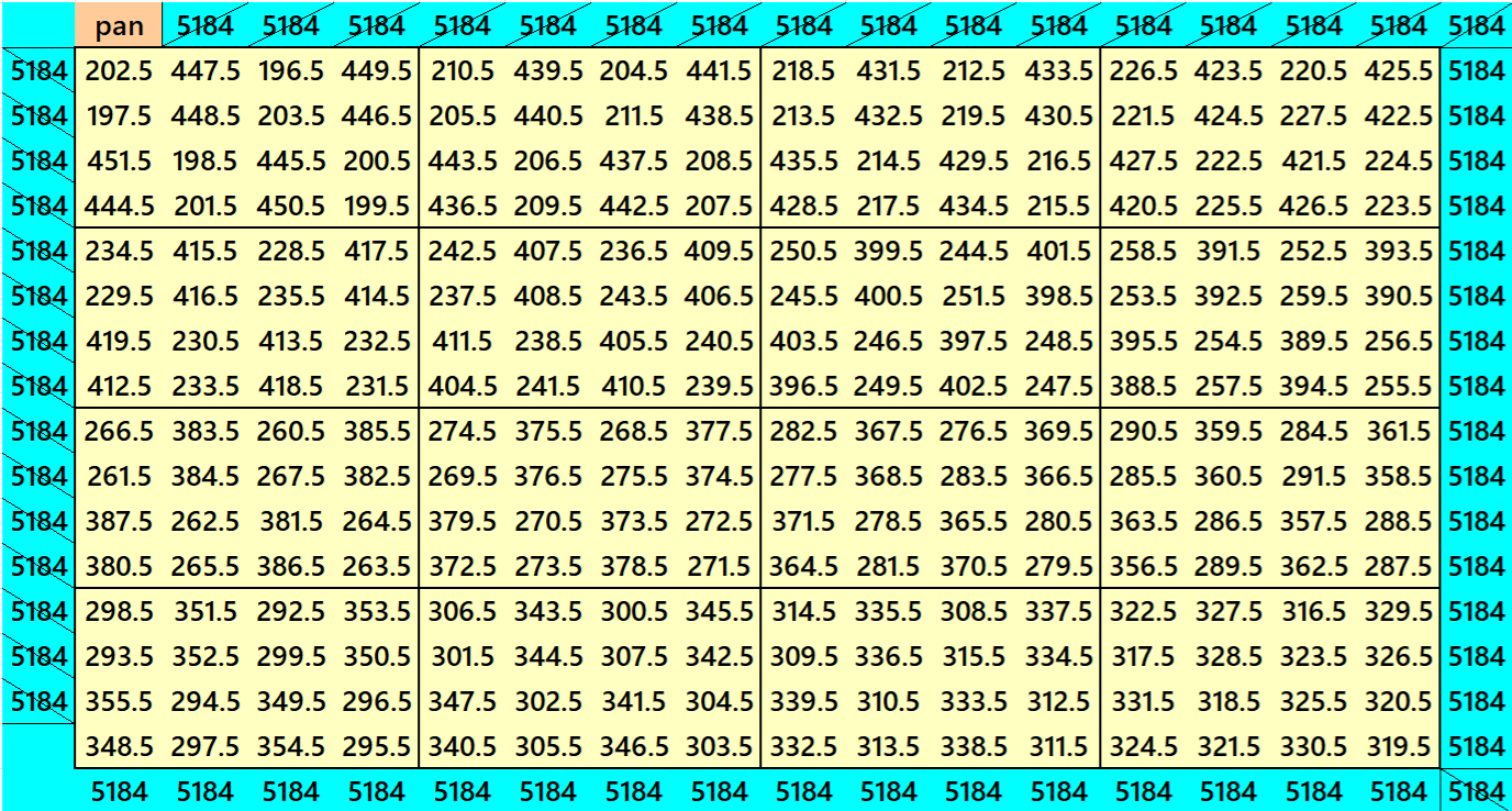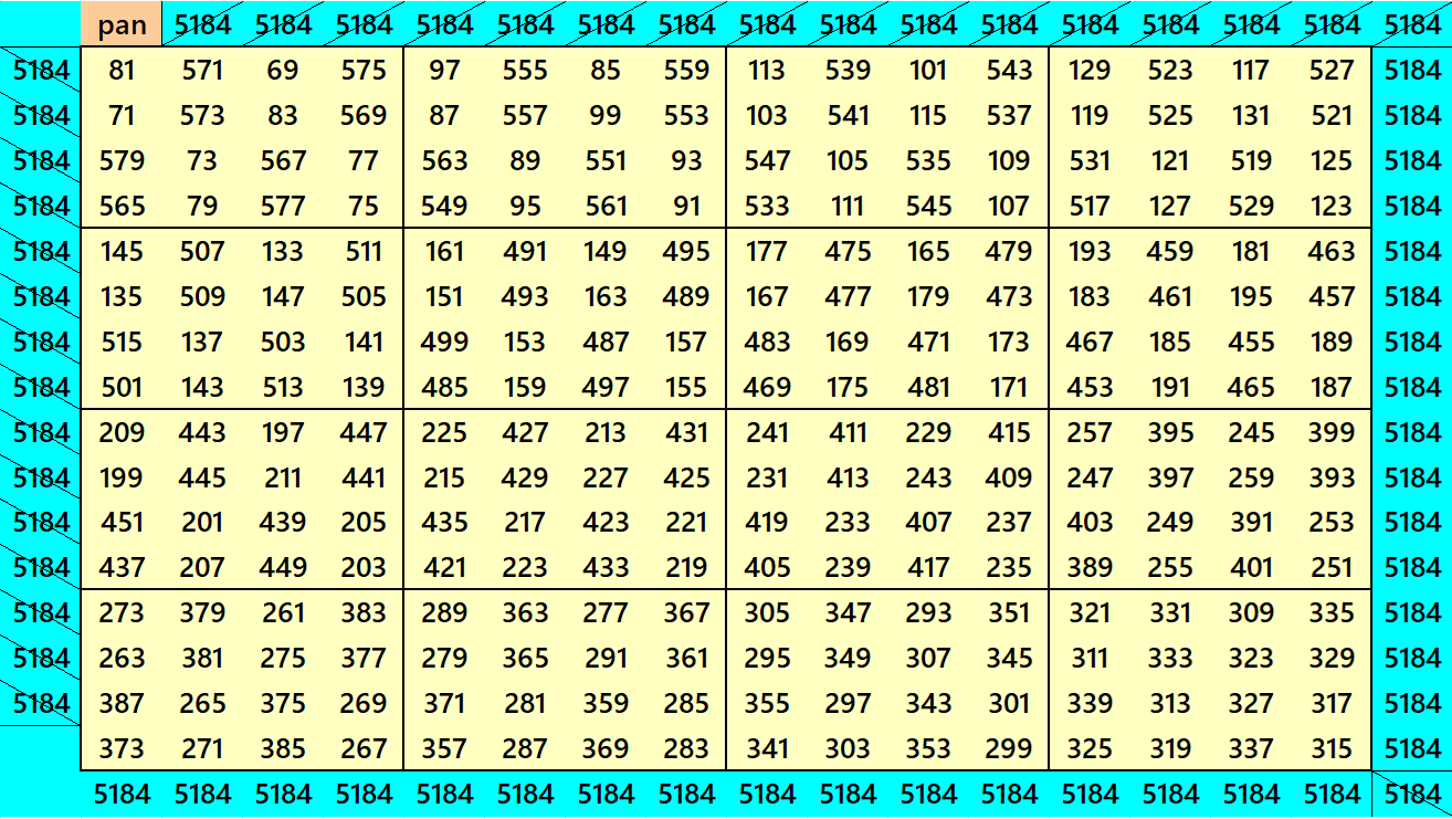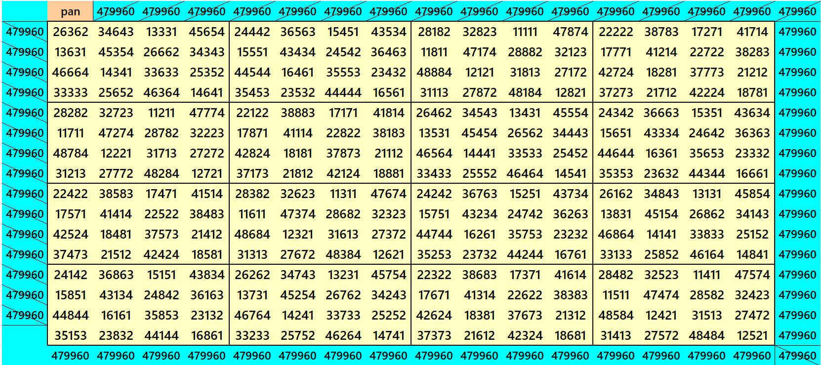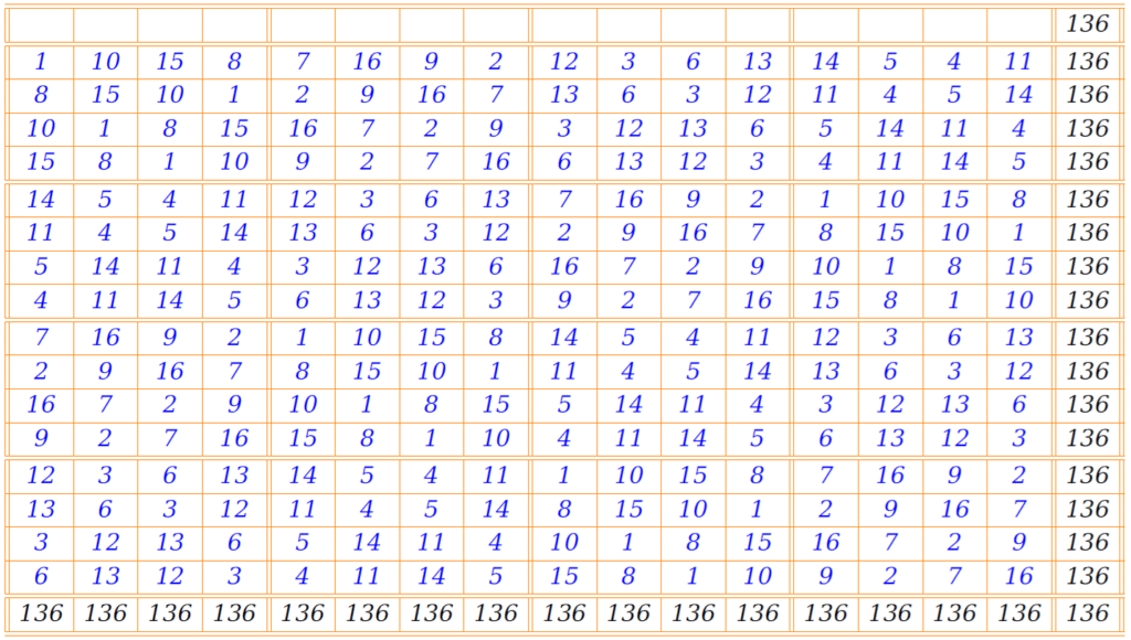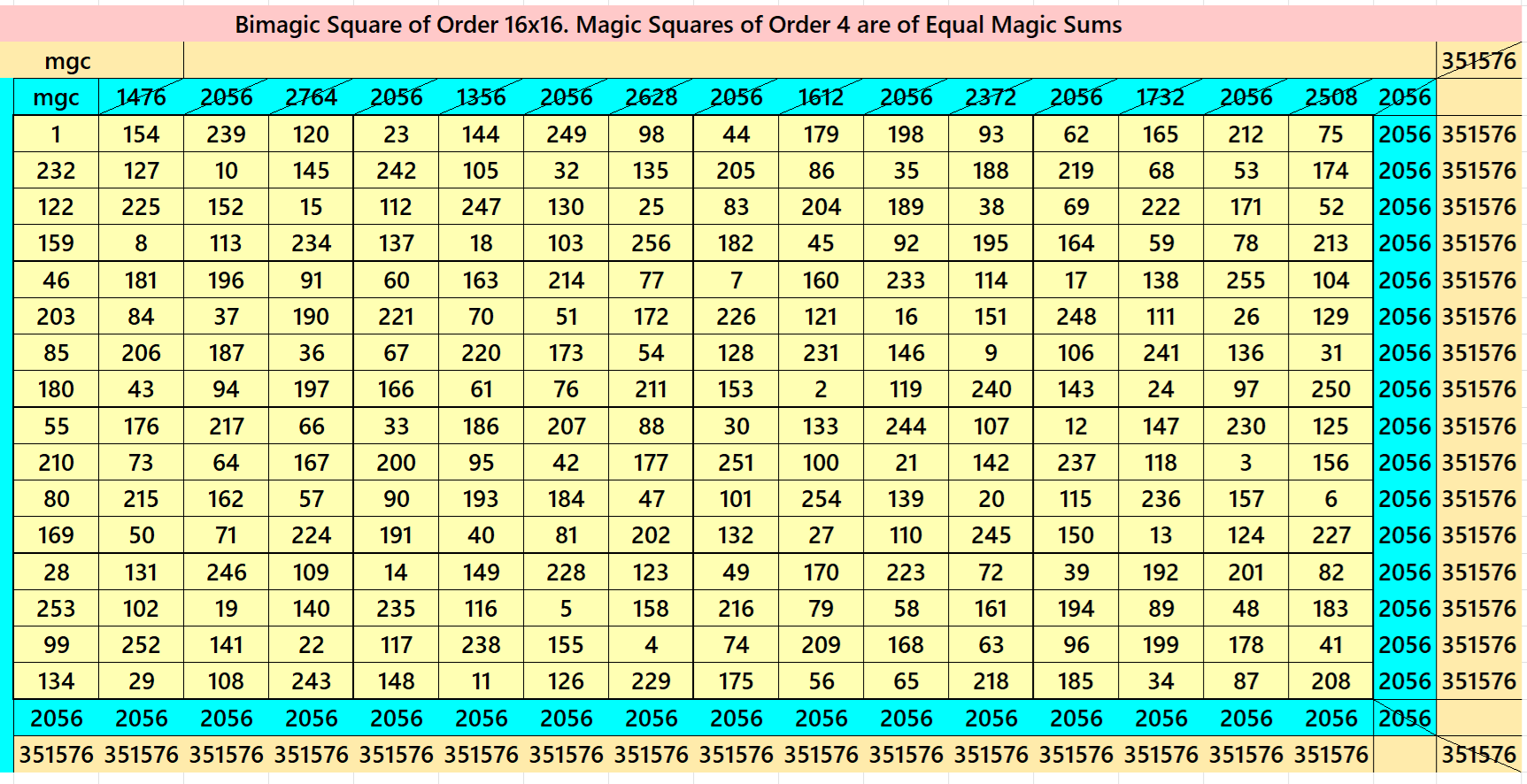 In this case, the magic and bimagic sums are S16×16 := 479960 and Sb16×16 := 16484528520 respectively. The blocks of order 4 are also magic squares with equal magic sums S4×4 := 119990.