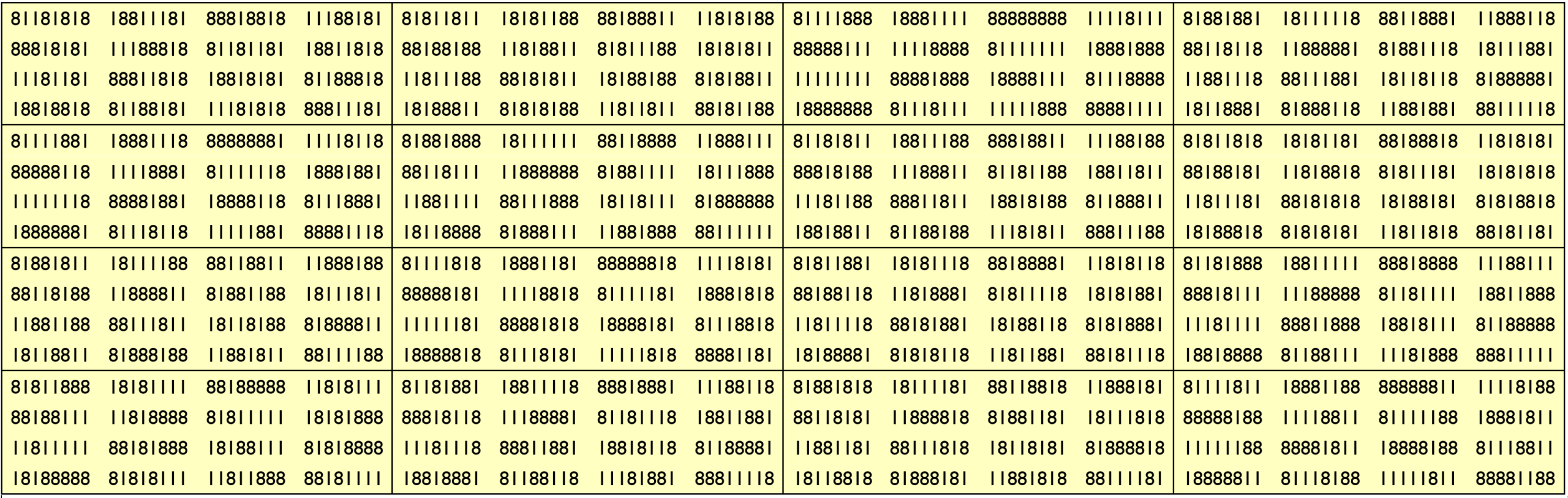 The above magic square is water reflexive with equal magic sums. The blocks of order 4 are magic squares with equal magic sums. It is bimagic. The magic sums are S16×16(0, 1, 3, 8) := 53328 and Sb16×16(0, 1, 3, 8) := 331277576. The blocks of order 4 are magic squares with equal magic sums, i.e., S4×4(0, 1, 3, 8) := 13332.