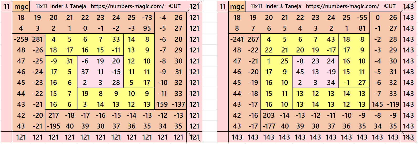 It is an algebraic cyclic-type magic square of order 11 composed of four equal sums magic rectangles of orders 2×9 embedded with a magic square of order 7. It is again composed of four equal sums magic rectangles of order 2×5 having a magic square of order 3 in the middle. In this case the magic sums are S3×3:=S, S7×7:=7*S/3 and S11×11:=11*S/3, where S is the magic sum of order 3. In this case, m:=2*S/3 is the width of magic rectangles. To avoid decimal entries the magic sums of order 3 should be multiple of 3. See below two examples: