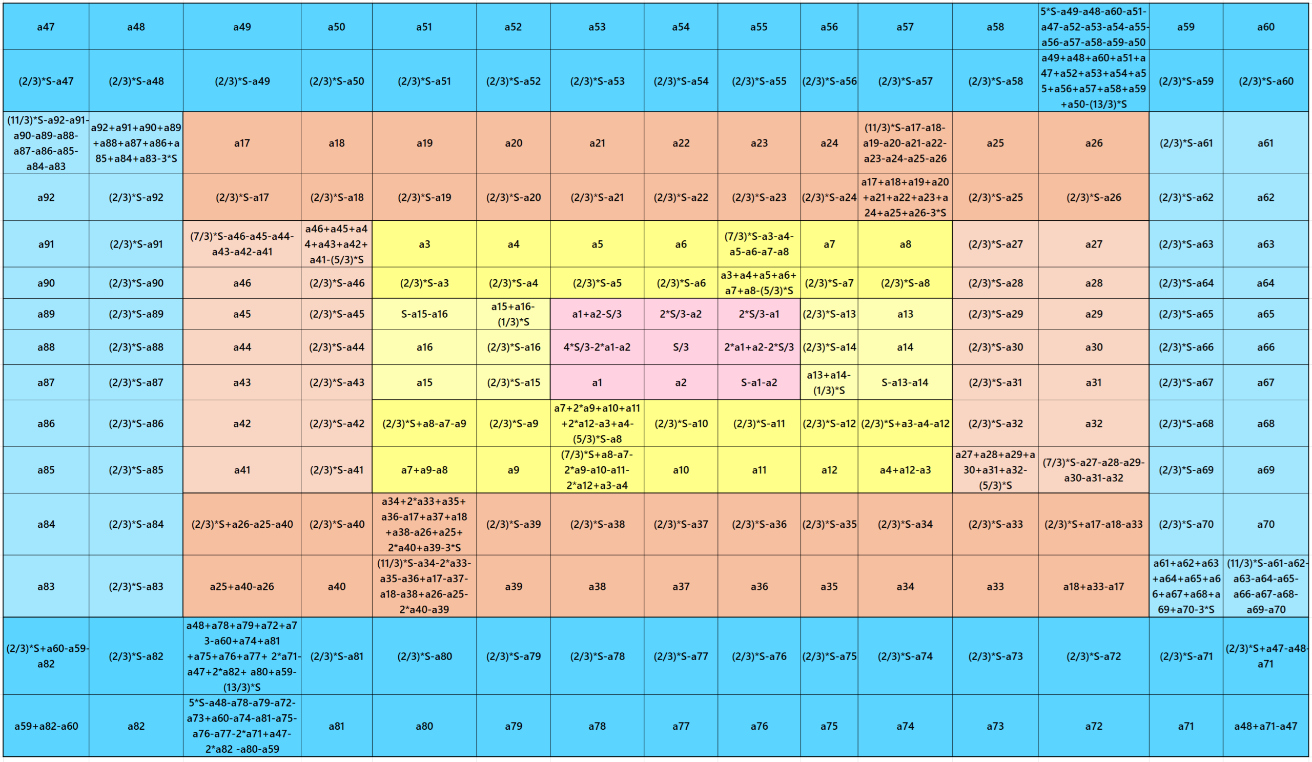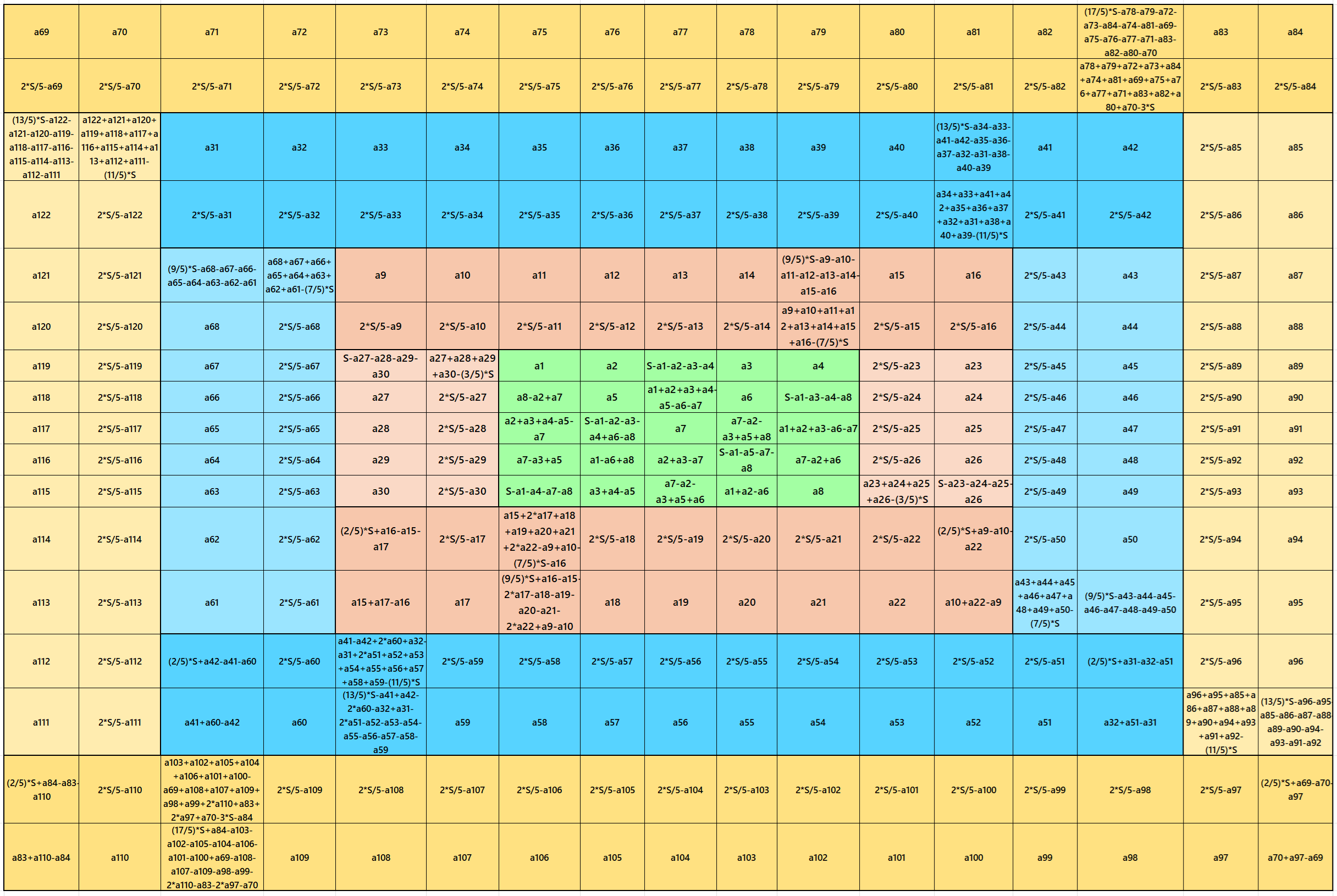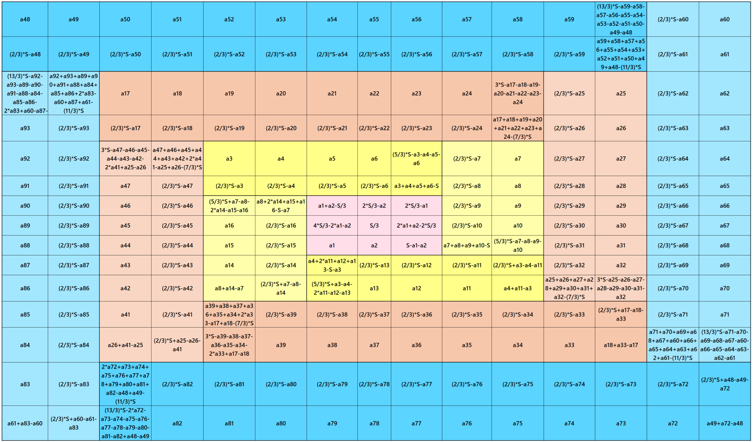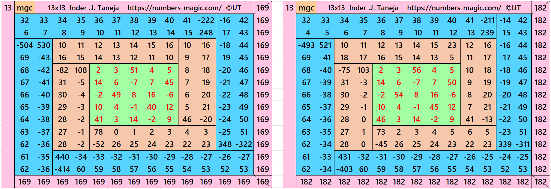 It is an algebraic cornered striped magic square of order 13, where the magic squares of order 3, 5, 7, 9 and 11 are at the upper-left corner. The magic squares of orders 5, 7, 9 and 11 are also algebraic cornered magic squares In this case the magic sums are S3×3:=S, S5×5:=5*S/3, S7×7:=7*S/3, S9×9:=3*S, S11×11:=11*S/3 and S13×13:=13*S/3, where S is the magic sum of order 3. In this case, m:=2*S/3 is the width of magic rectangles. To avoid decimal entries the magic sums of order 3 should be multiple of 3. See below two examples: