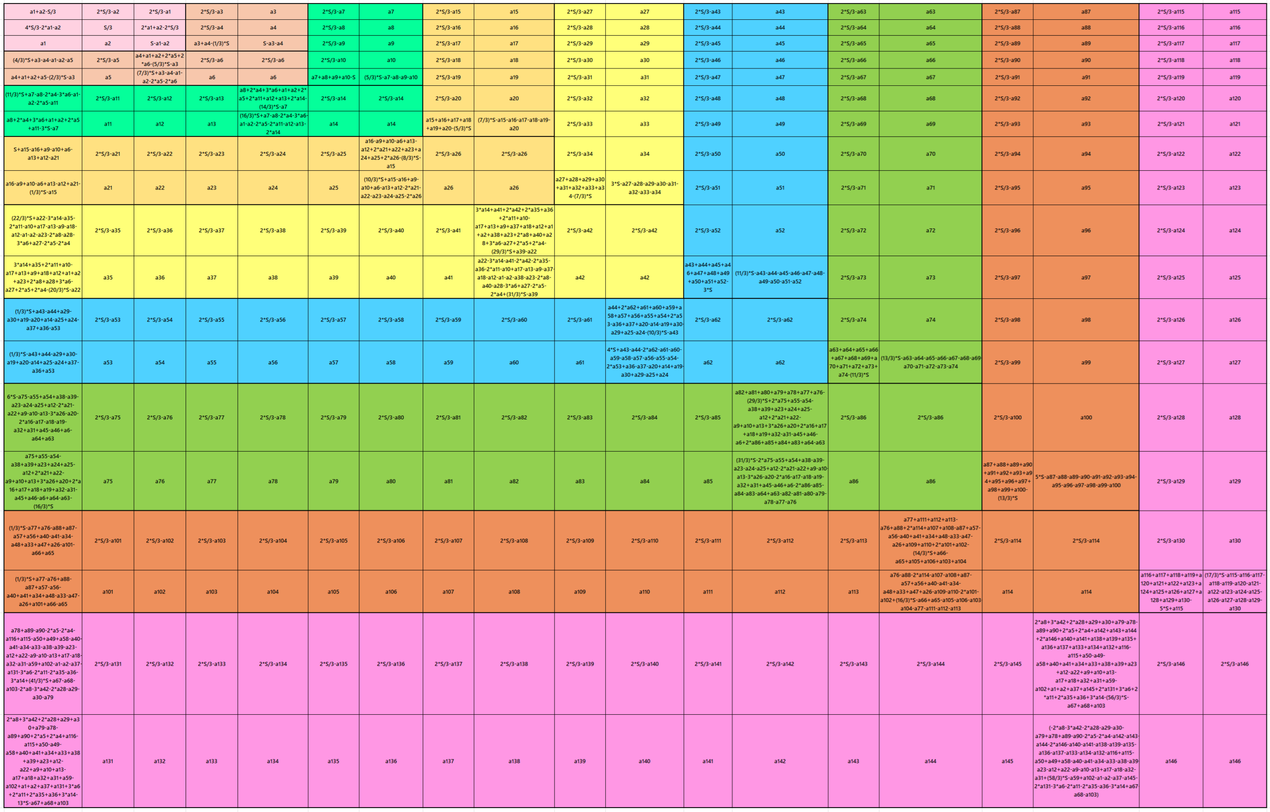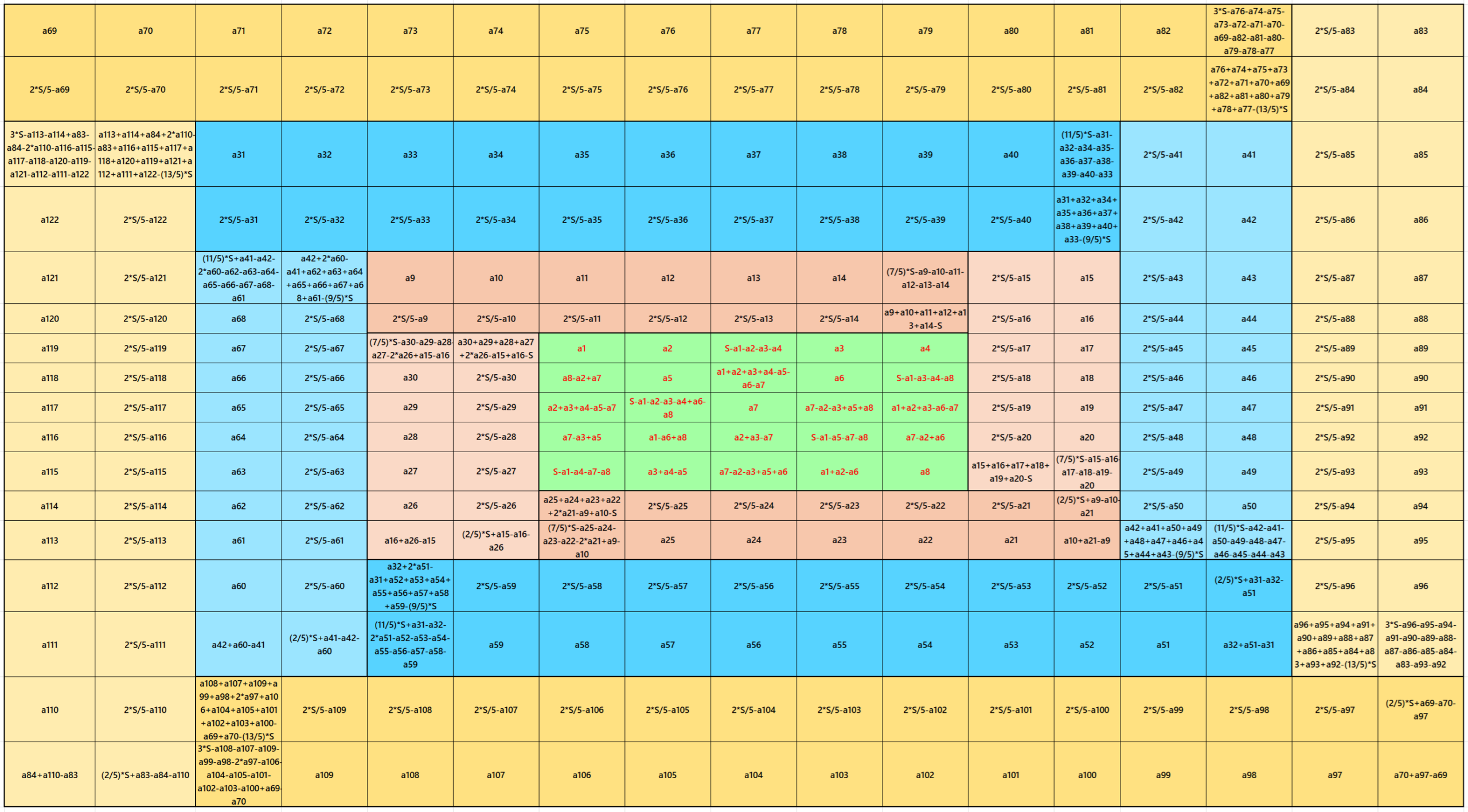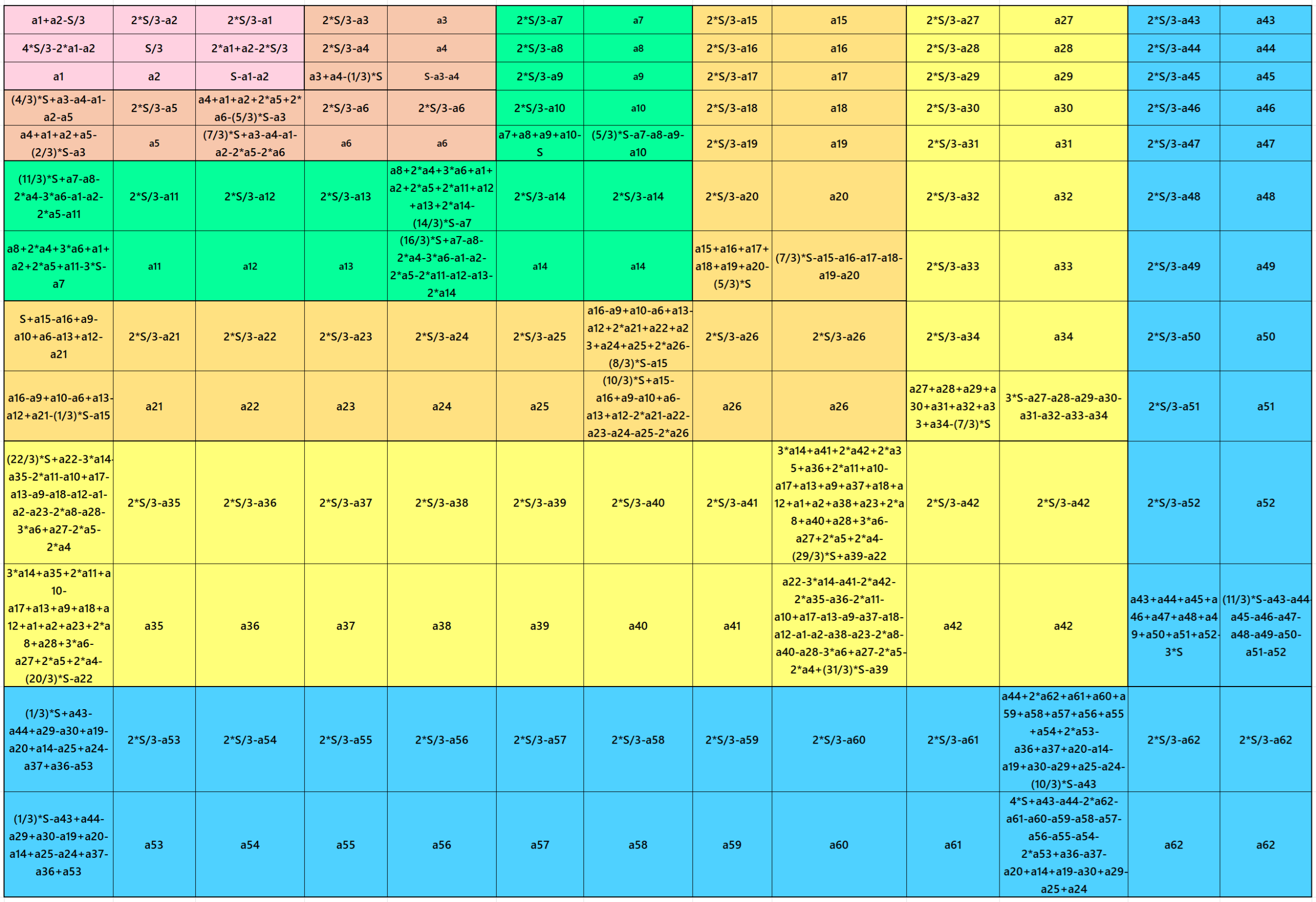 It is an algebraic cornered striped magic square of order 13, where the magic squares of order 3, 5, 7, 9 and 11 are at the upper-left corner. The magic squares of orders 5, 7, 9 and 11 are also algebraic cornered magic squares In this case the magic sums are S3×3:=S, S5×5:=5*S/3, S7×7:=7*S/3, S9×9:=3*S, S11×11:=11*S/3 and S13×13:=13*S/3, where S is the magic sum of order 3. In this case, m:=2*S/3 is the width of magic rectangles. To avoid decimal entries the magic sums of order 3 should be multiple of 3. See below two examples: