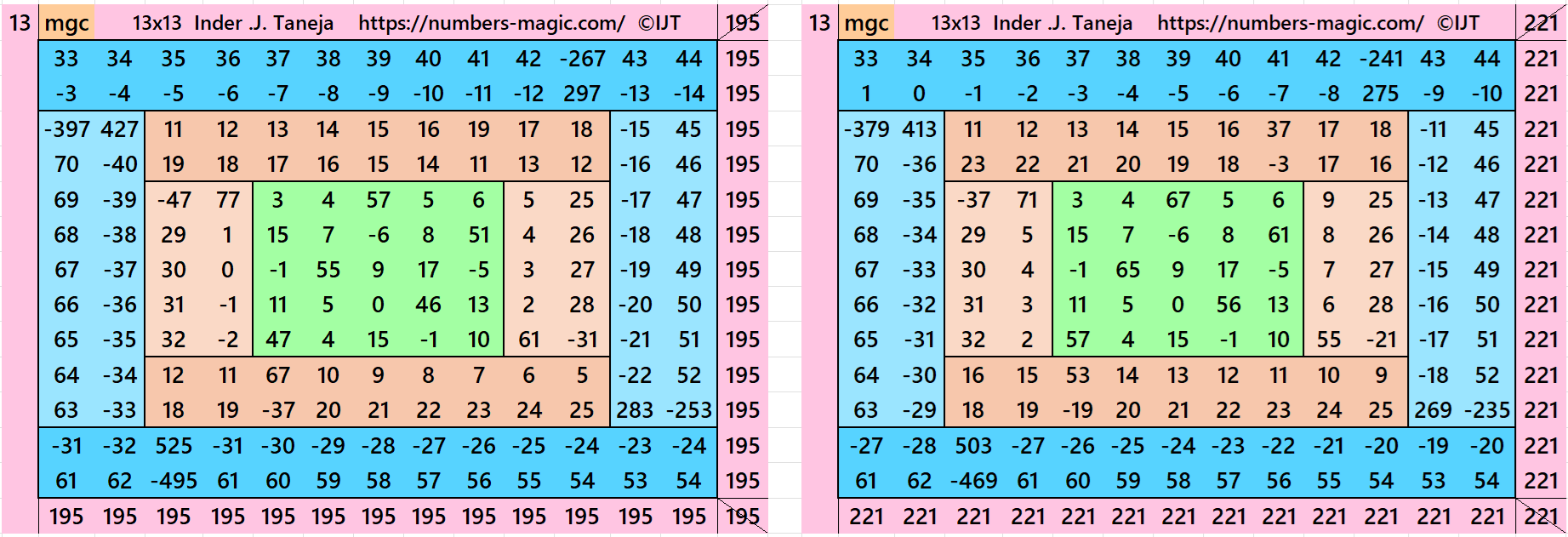 It is an algebraic cyclic-type magic square of order 13 composed of four equal sums magic rectangles of orders 2×11 embedded with a magic square of order 9. It is again composed of four equal sums magic rectangles of order 2×7 having a magic square of order 5 in the middle. In this case the magic sums are S5×5:=S, S9×9:=9*S/5 and S13×13:=13*S/5, where S is the magic sum of order 5. In this case, m:=2*S/5 is the width of magic rectangles. To avoid decimal entries the magic sums of order 5 should be multiple of 5. See below two examples: