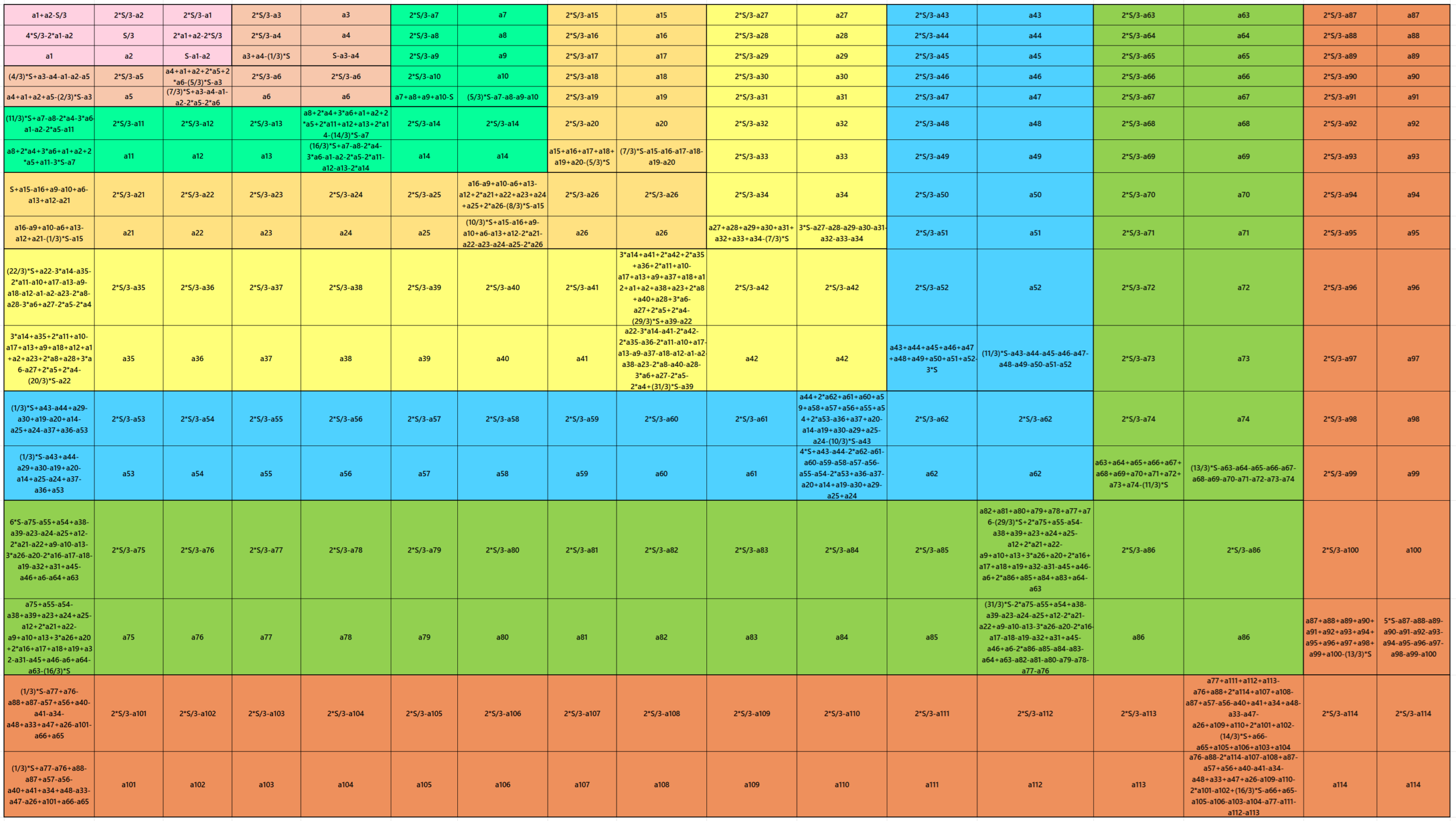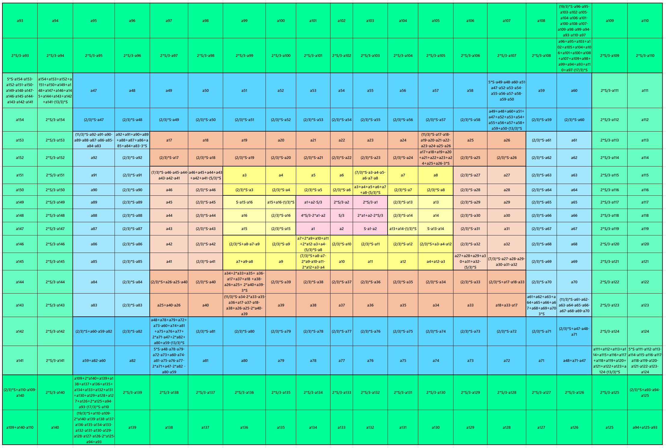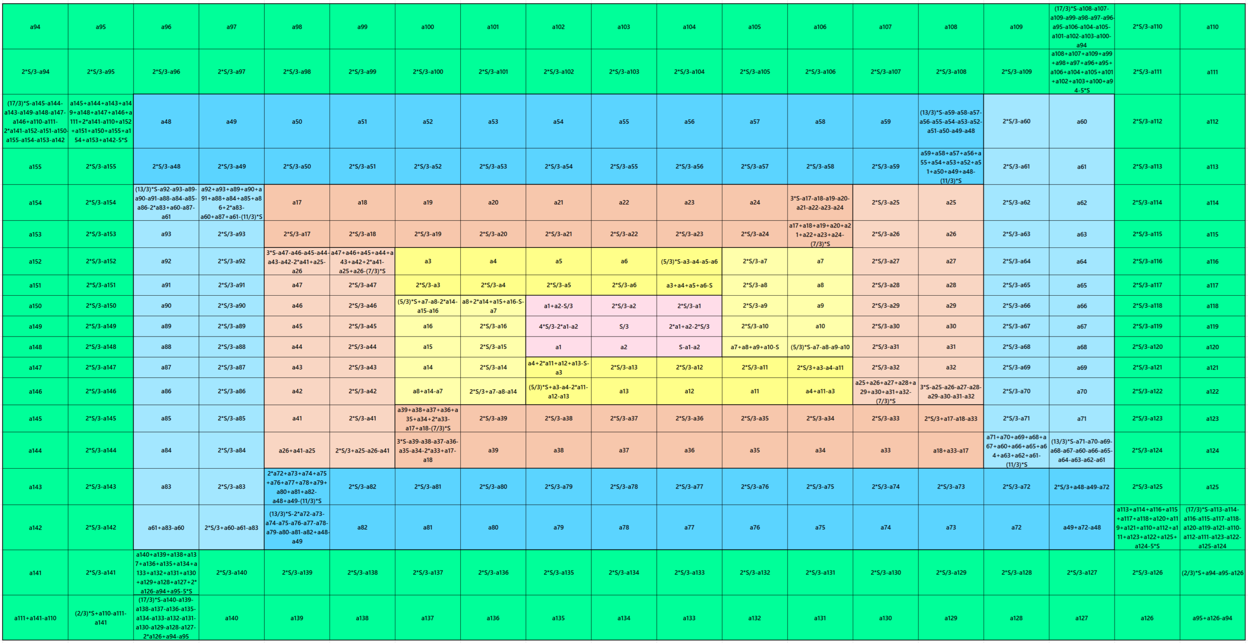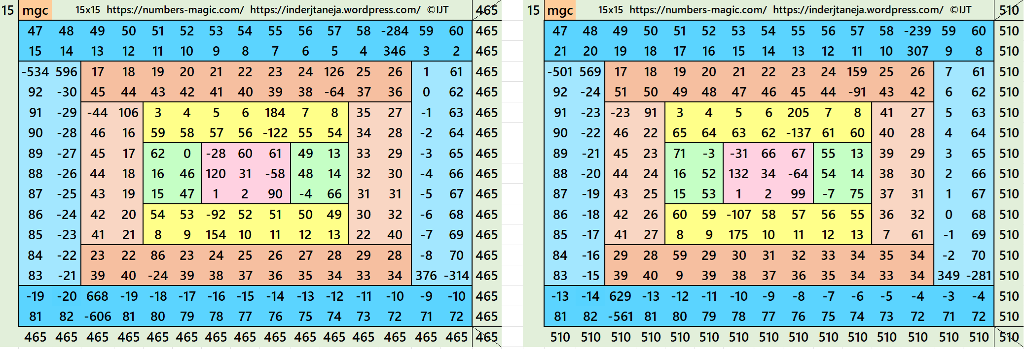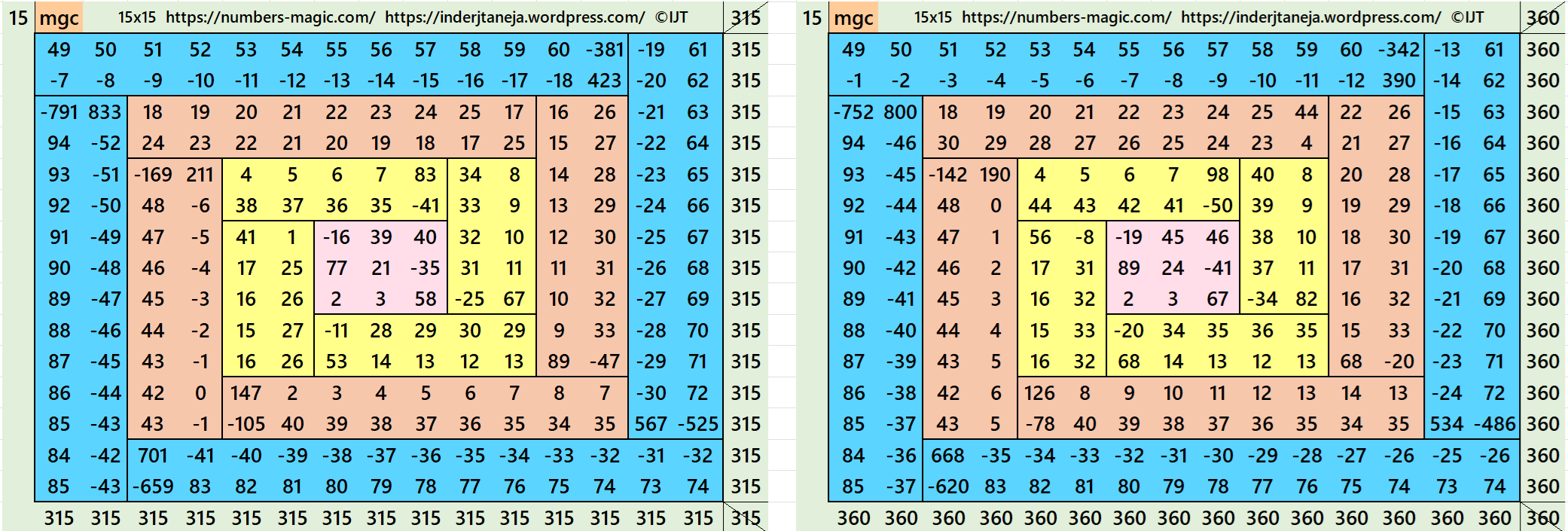 It is an algebraic cornered striped magic square of order 15, where the magic squares of order 3, 5, 7, 9, 11 and 13 are at the upper-left corner. The magic squares of orders 5, 7, 9, 11 and 13 are also algebraic cornered magic squares In this case the magic sums are S3×3:=S, S5×5:=5*S/3, S7×7:=7*S/3, S9×9:=3*S, S11×11:=11*S/3, S13×13:=13*S/3 and S15×15:=5*S, where S is the magic sum of order 3. In this case, m:=2*S/3 is the width of magic rectangles. To avoid decimal entries the magic sums of order 3 should be multiple of 3. See below two examples: