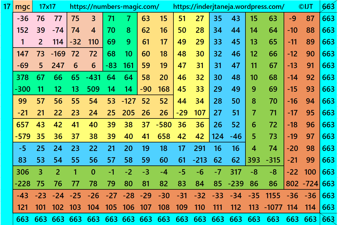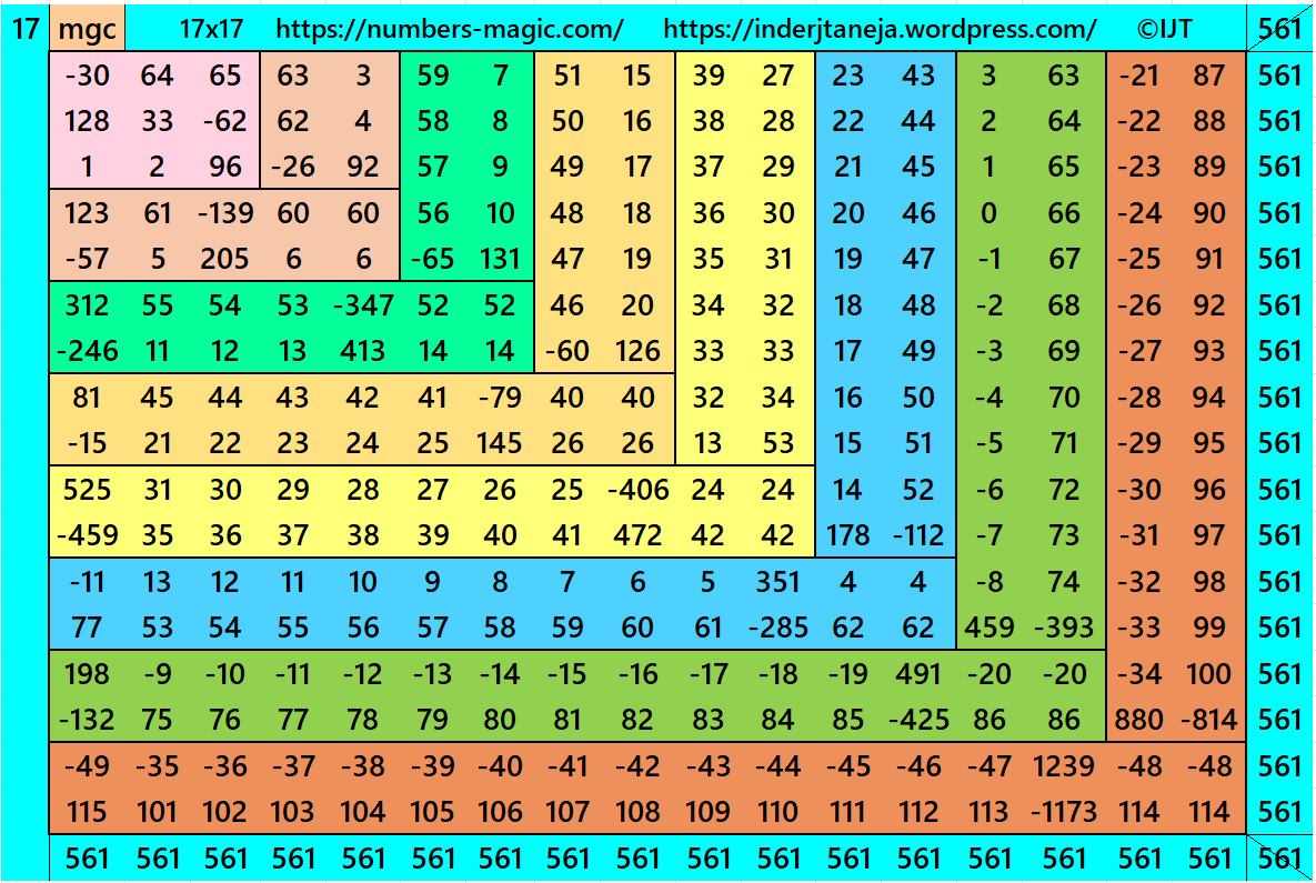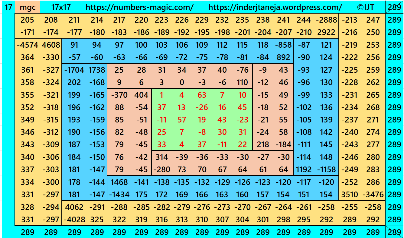 It is an algebraic cornered striped magic square of order 17, where the magic squares of order 3, 5, 7, 9, 11, 13 and 15 are at the upper-left corner. The magic squares of orders 5, 7, 9, 11, 13 and 15 are also algebraic cornered magic squares. In this case the magic sums are S3×3:=S, S5×5:=5*S/3, S7×7:=7*S/3, S9×9:=3*S, S11×11:=11*S/3, S13×13:=13*S/3, S15×15:=5*S and S17×17:=17*S/3, where S is the magic sum of order 3. In this case, m:=2*S/3 is the width of magic rectangles. To avoid decimal entries the magic sums of order 3 should be multiple of 3. See below two examples: