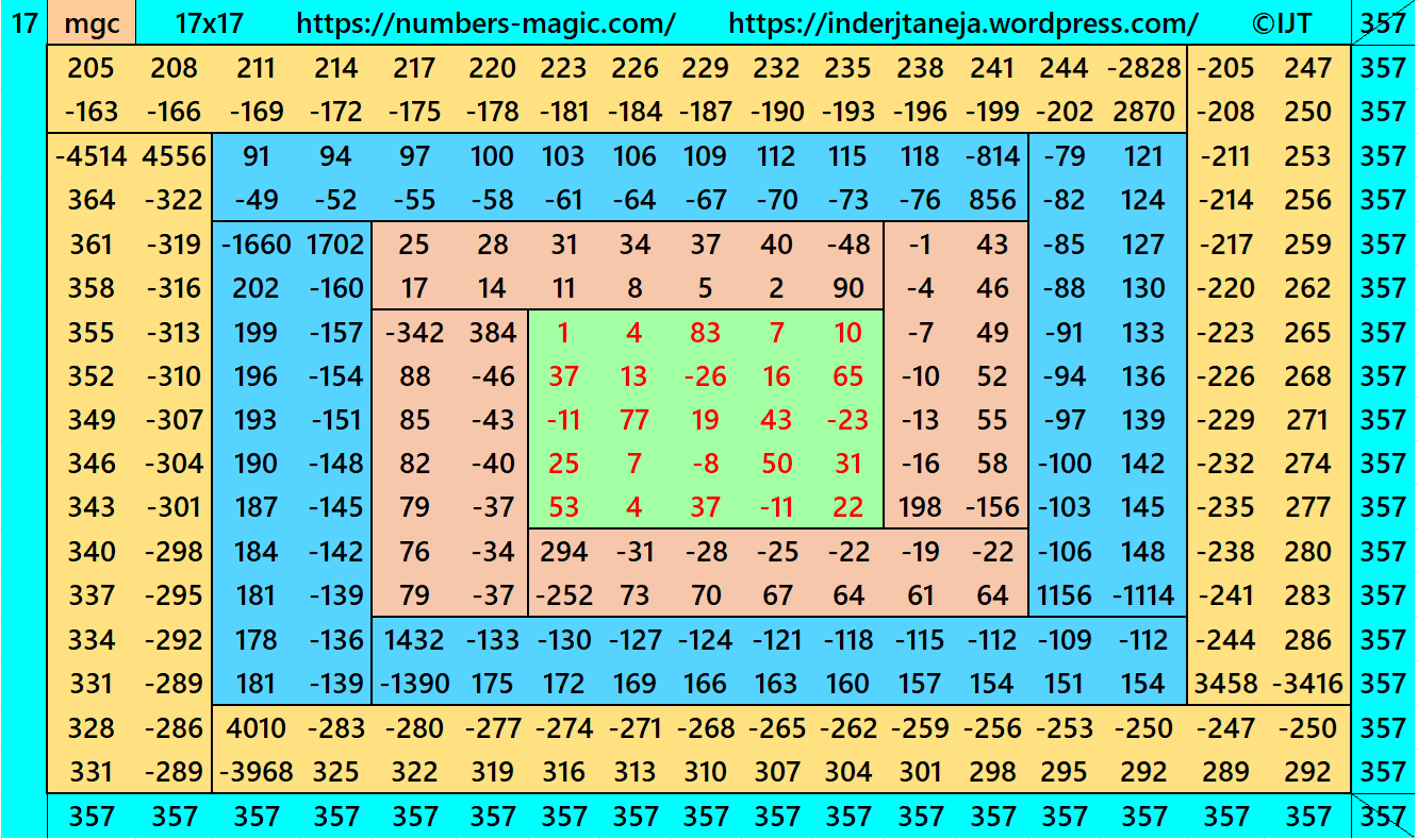 In this example the magic sums are S5×5:=105, S9×9:=189, S13×13:=273, S17×17:=357 and m:=42.