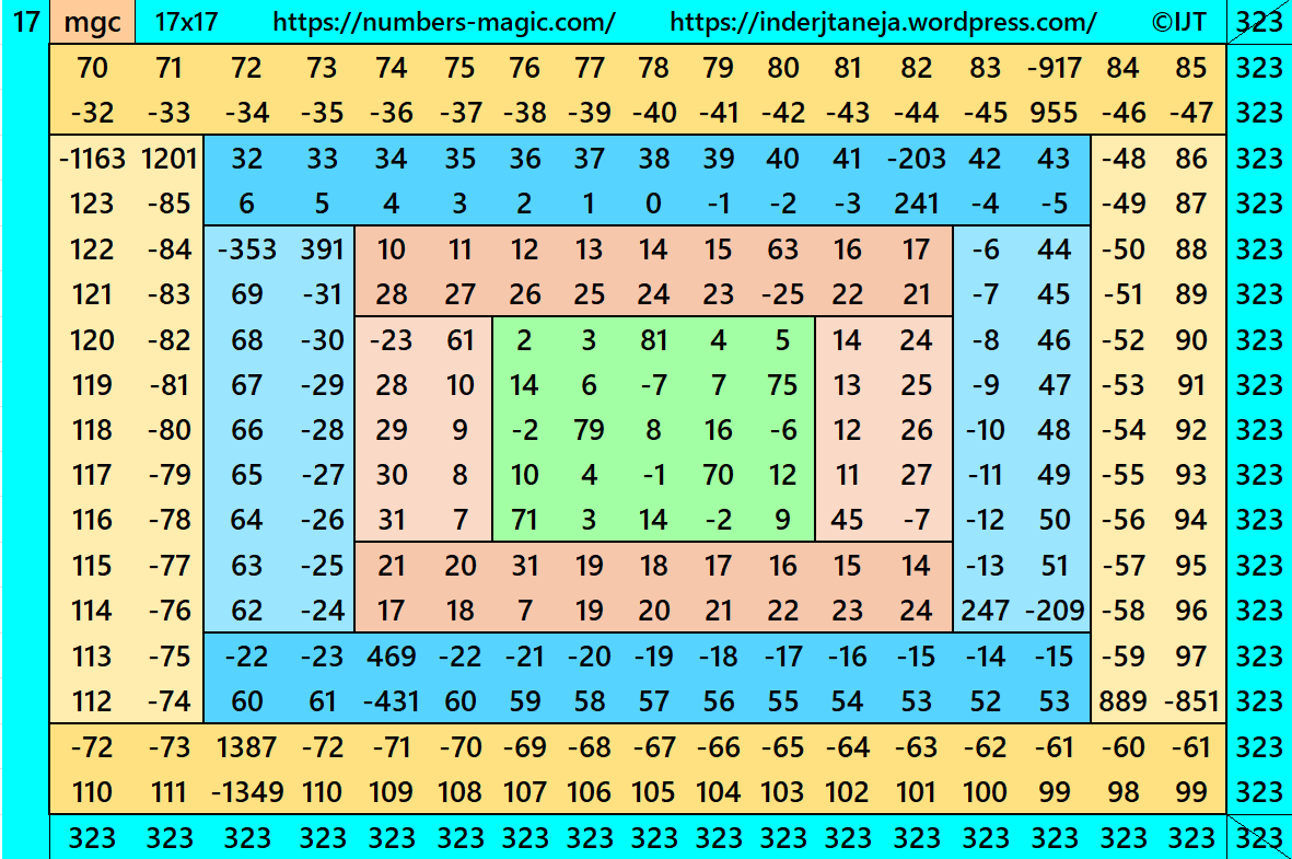 In this example the magic sums are S5×5:=95, S9×9:=171, S13×13:=247, S17×17:=323 and m:=38.