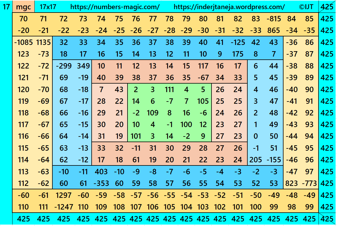 It is an algebraic cyclic-type magic square of order 17 composed of four equal sums magic rectangles of orders 2×15 embedded with a magic square of order 13. It is again composed of four equal sums magic rectangles of order 2×11 and so on having a magic square of order 5 in the middle. In this case the magic sums are S5×5:=S, S9×9:=3*S, S13×13:=13*S/3 and S17×17:=17*S/3, where S is the magic sum of order 5. In this case, m:=2*S/5 is the width of magic rectangles. To avoid decimal entries the magic sums of order 5 should be multiple of 5. See below two examples: