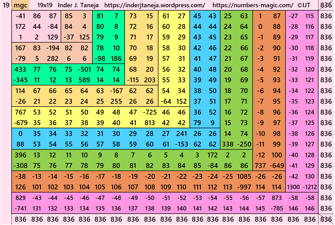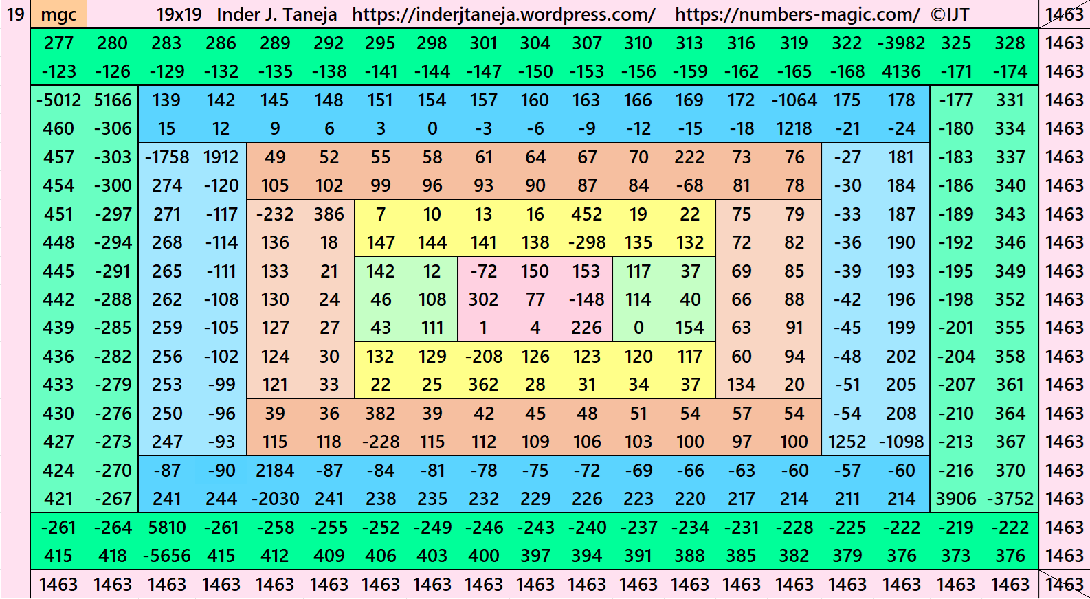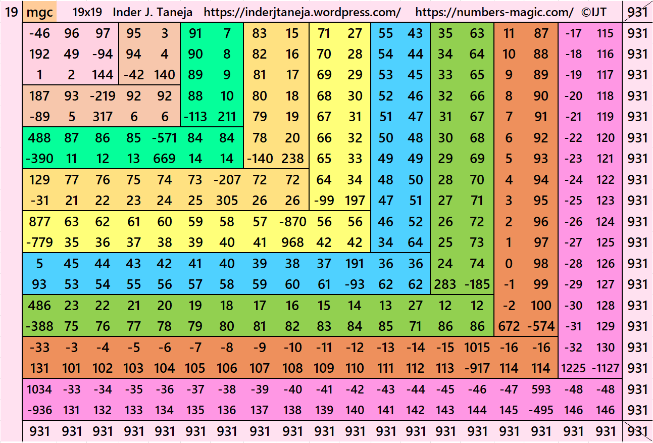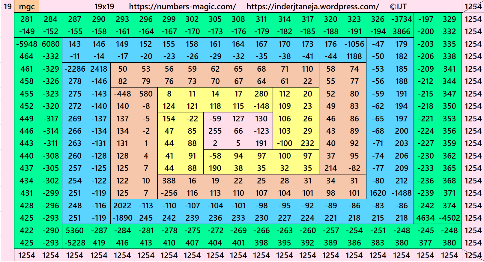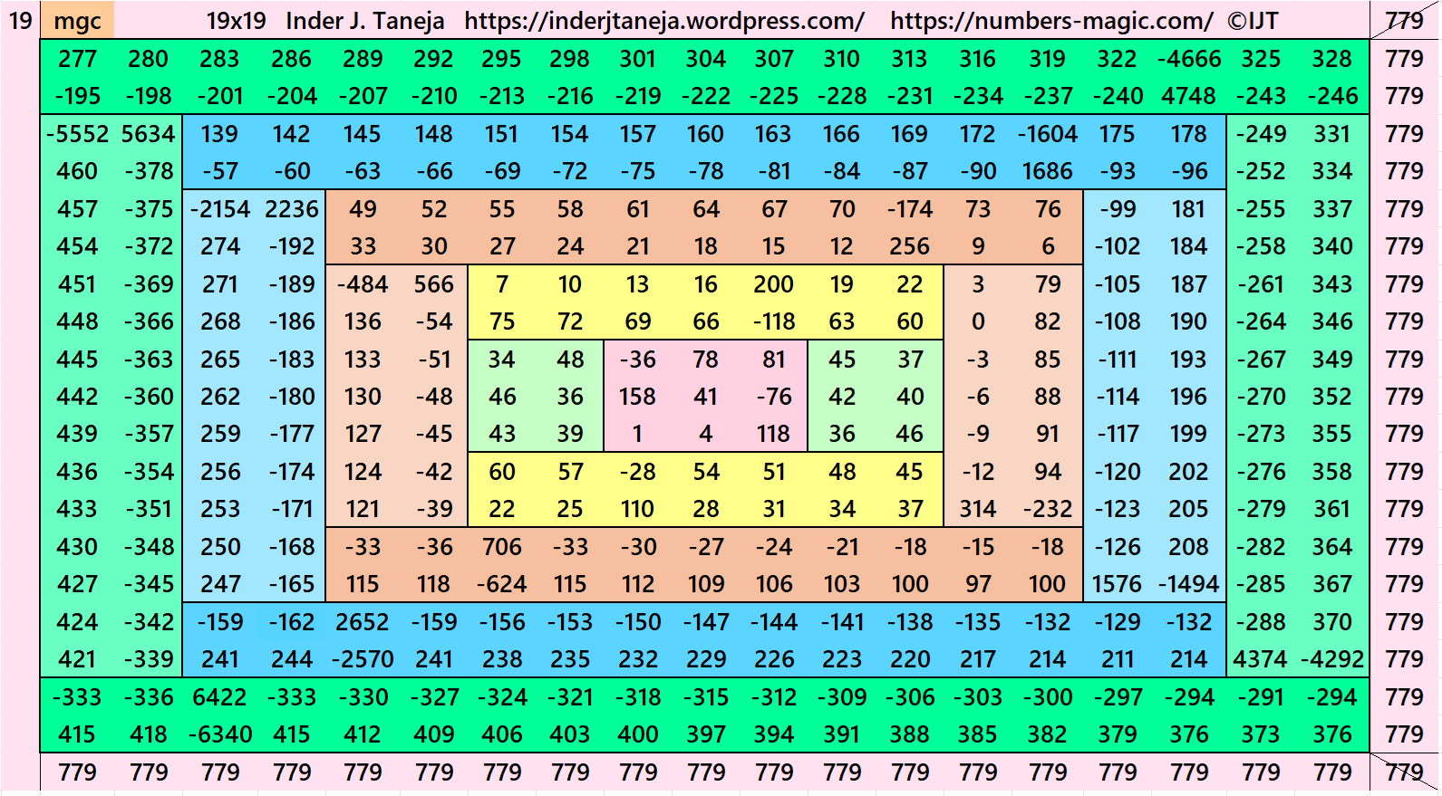 It is an algebraic flat-type magic square of order 19 composed of two equal sums magic rectangles of orders 2×19 and two equal sums magic rectangles of order 2×15 embedded again with a flat-type magic square of order 15 and so on. In this case the magic sums are S3×3:=S, S7×7:=7*S/3, S11×11:=11*S/3, S15×15:=5*S and S19×19:=19*S/3, where S is the magic sum of order 3. In this case, m:=2*S/3 is the width of magic rectangles, where S is the magic sum of order 3. In this case, m:=2*S/3 is the width of magic rectangles. To avoid decimal entries the magic sums of order 3 should be multiple of 3. See below two examples: