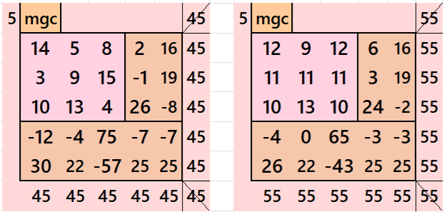 In the first example the magic sums are S5×5 :=45, S9×9 :=81 and m:=18.