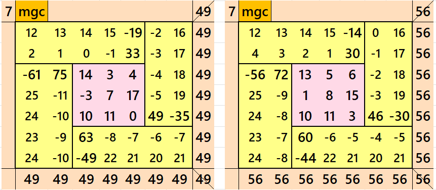 In the second example the magic sums are S3×3 :=24, S7×7 :=56 and m:=16.