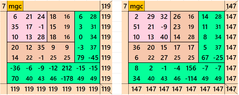 In the second example the magic sums are S3×3 := 39, S7×7:=91, S11×11 :=143 and m:=26.