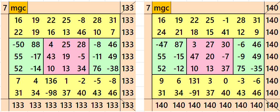 In the second example the magic sums are S3×3 :=60, S7×7 :=140 and m:=40.