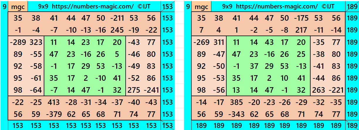 In the second example the magic sums are S5×5 :=105, S9×9 :=189 and m:=42.
