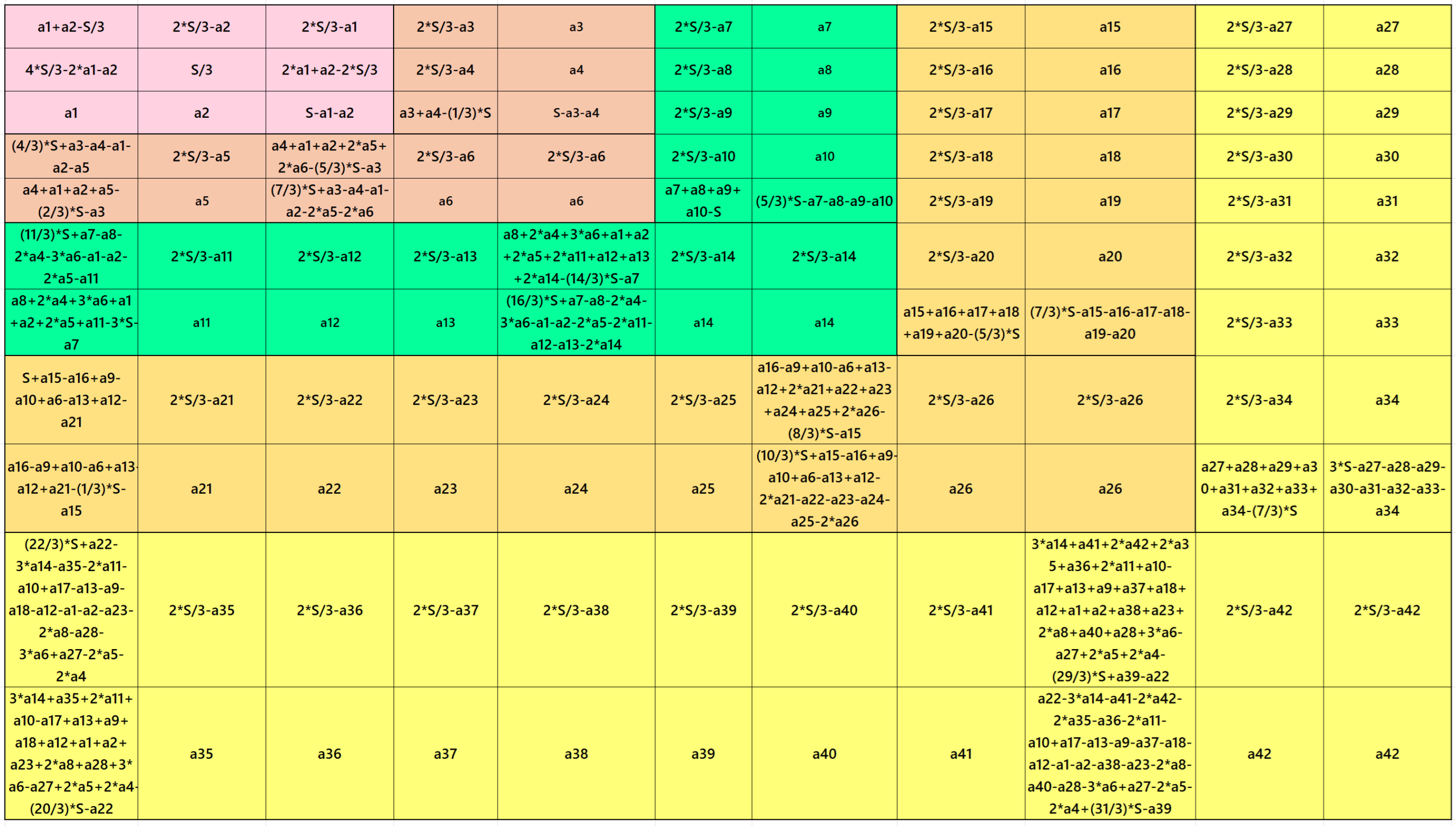 In the first example the magic sums are S3×3 :=21, S7×7 :=49 and m:=14.
