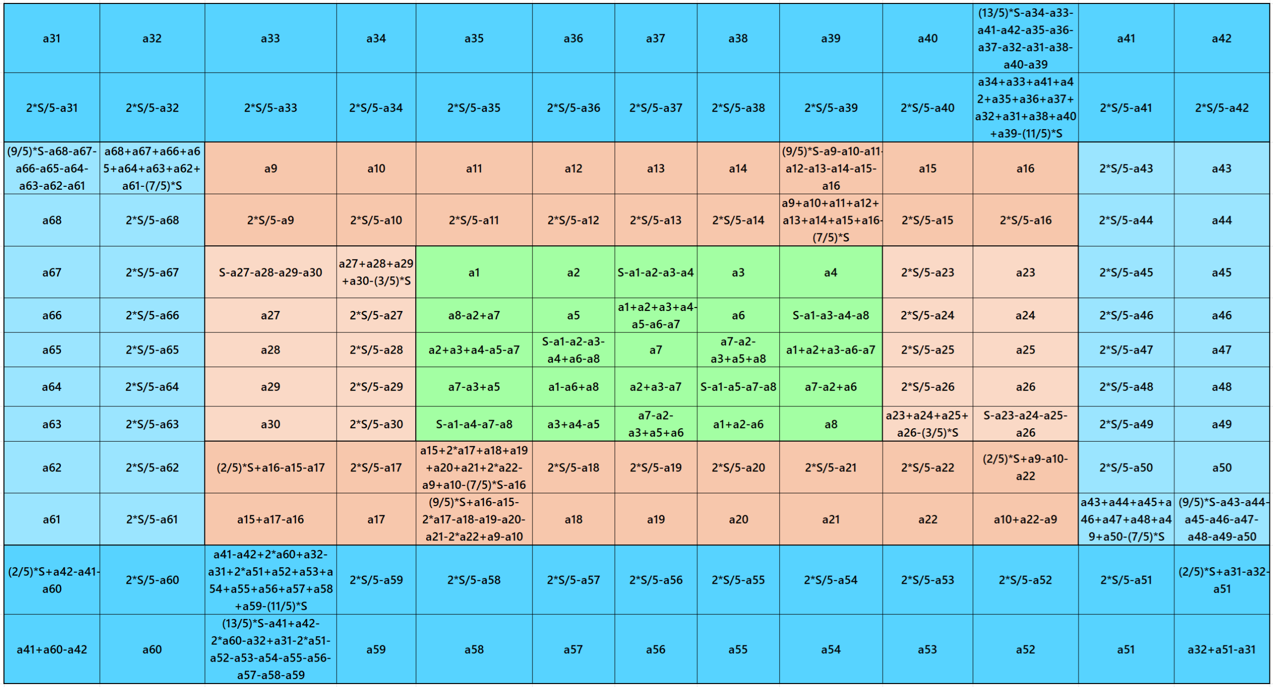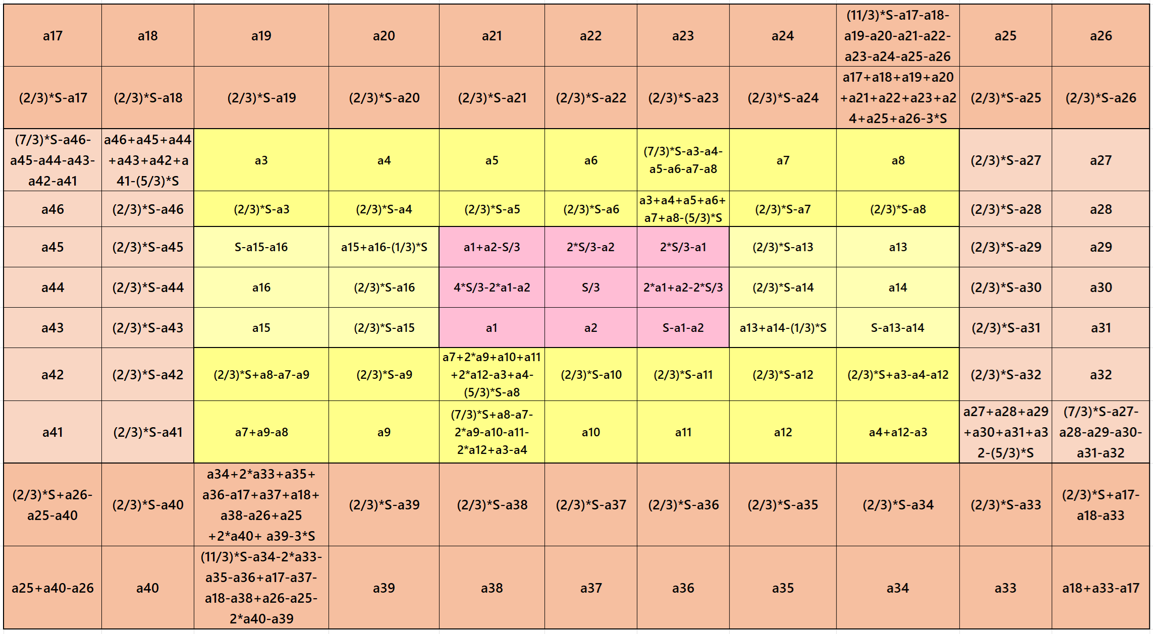 It is an algebraic flat-type magic square of order 13 composed of two equal sums magic rectangles of orders 2×13 and two equal sums magic rectangles of order 2×9 embedded again with a flat-type magic square of order 9. It is avgain a algebraic flat-type magic square of order 9 embedded with a magic square of order 5. In this case the magic sums are S5×5:=S, S9×9:=9*S/5 and S13×13:=13*S/5, where S is the magic sum of order 5. In this case, m:=2*S/5 is the width of magic rectangles. To avoid decimal entries the magic sums of order 5 should be multiple of 5. See below two examples: