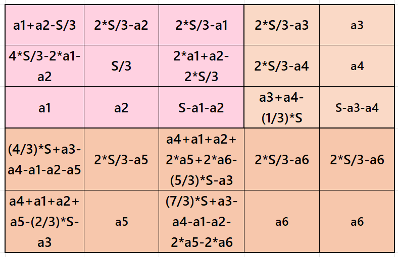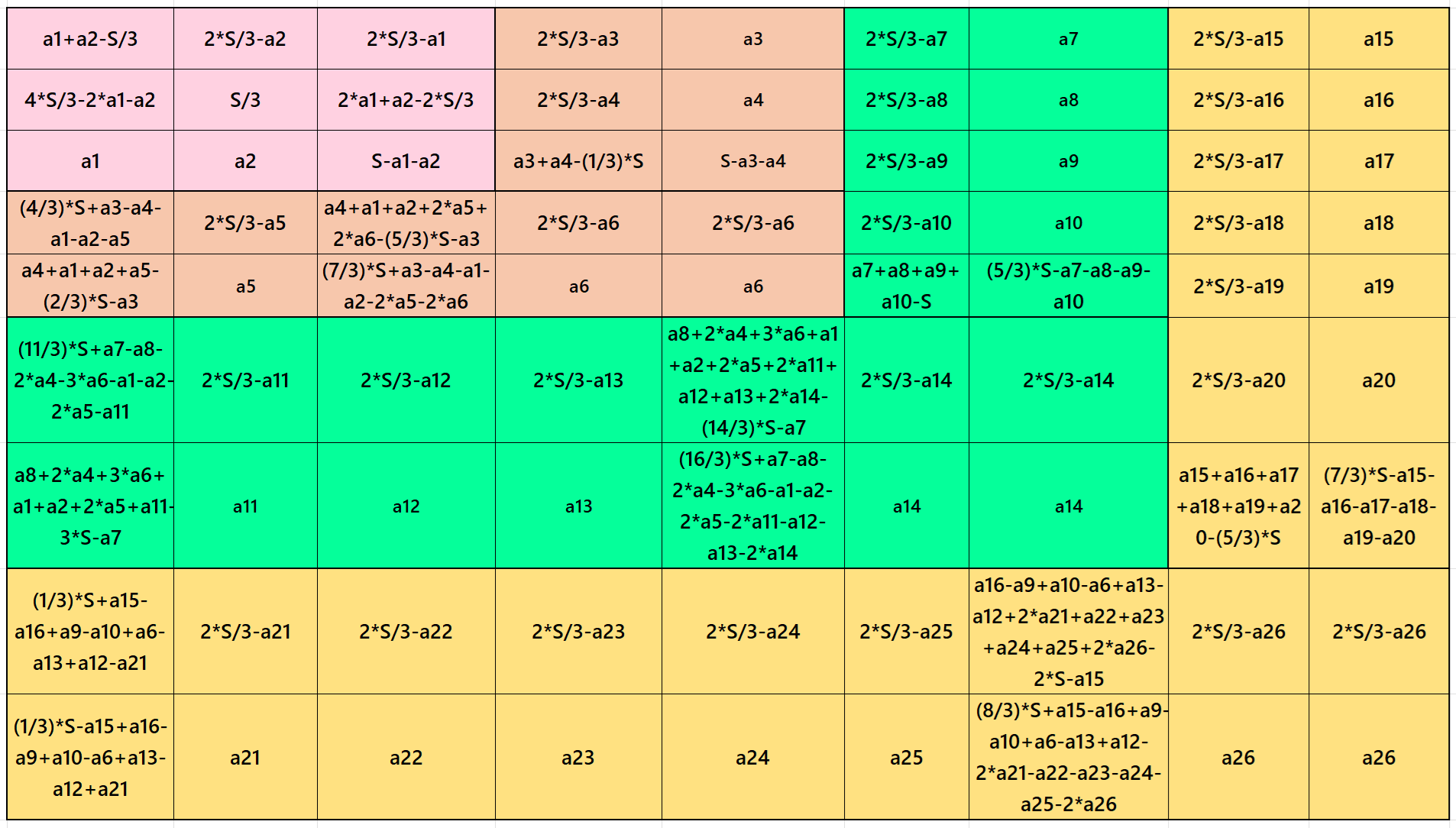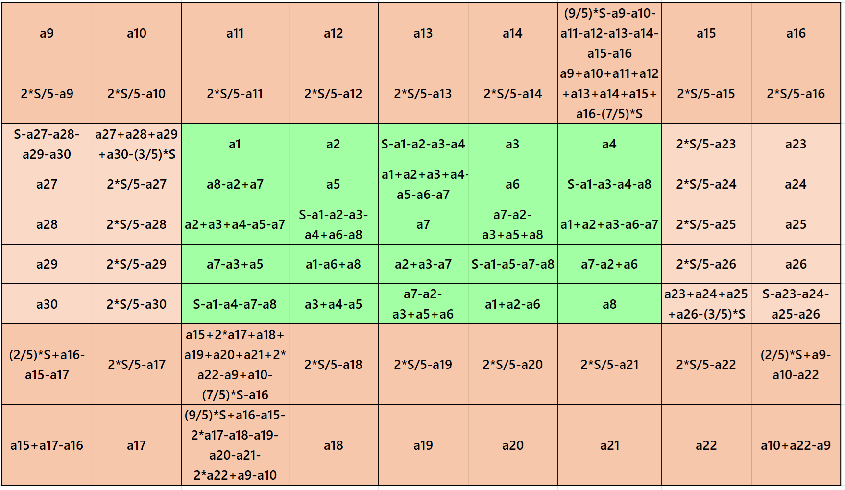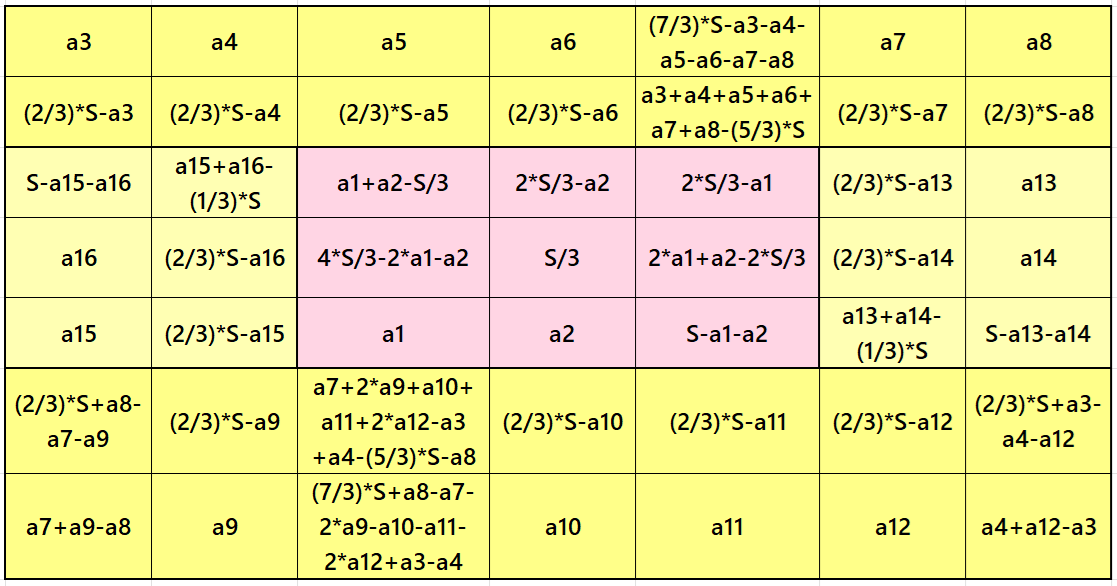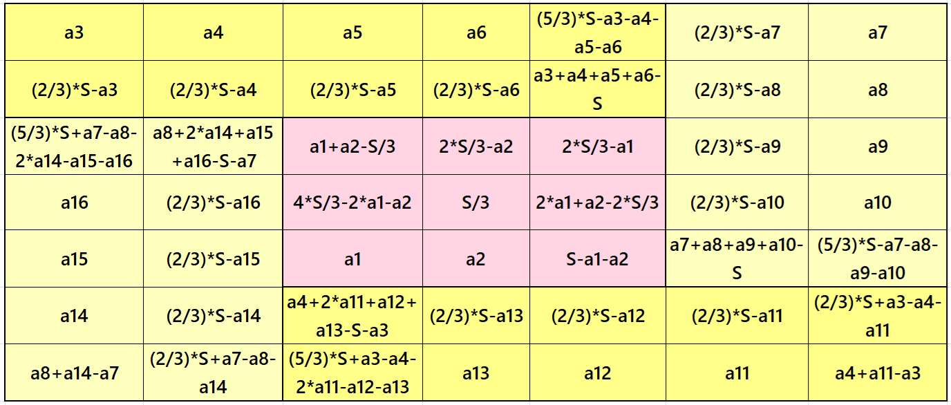 It is an algebraic cornered magic square of order 5, where there is a magic square of order 3 at the upper-left corner. There are two magic rectangles of order 2×5 and 2×3. The magic sum of order 5 is given as S5×5 := 5*S/3, where S is the magic sum of order 3. In order to avoid decimal entries the the magic sum of order 3,i.e., S should be multiple of 3. m:=2*S/3 is the width of the magic rectangle. See below few examples: