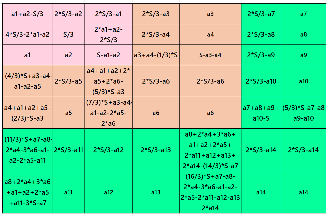 In the first example the magic sums are S3×3 :=57, S7×7 :=133 and m:=38.