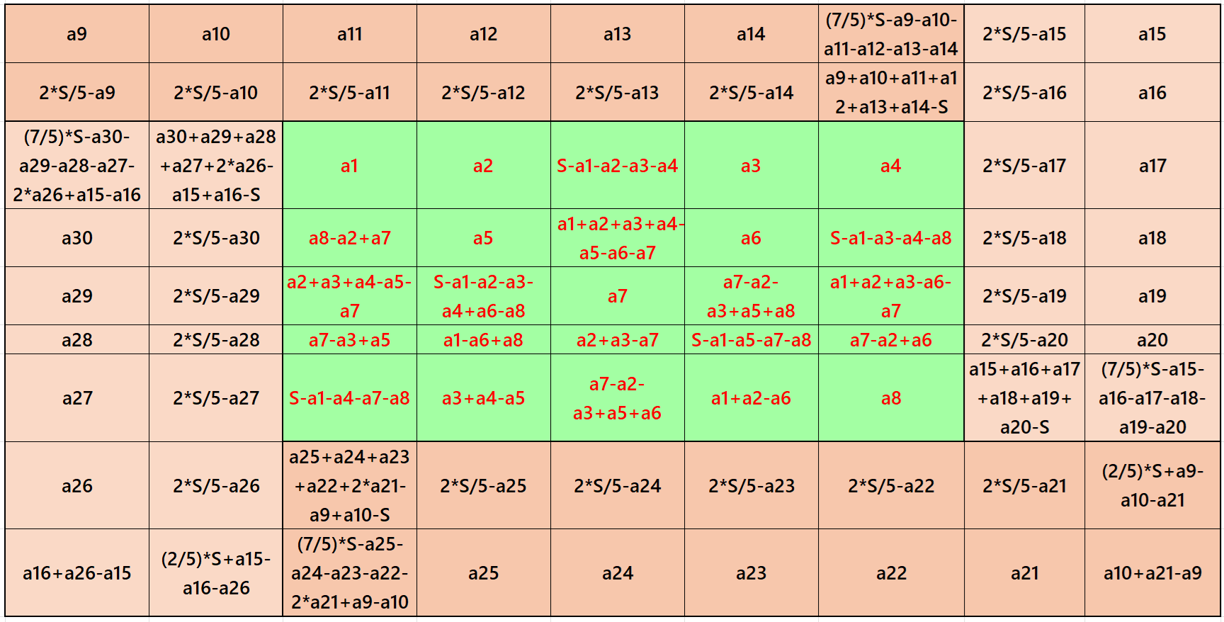 It is an algebraic cyclic-type magic square of order 9 composed of four equal sums magic rectangles of orders 2×7 embedded with a magic square of order 5. In this case the magic sums are S5×5:=S and S9×9:=9*S/5, where S is the magic sum of order 5. In this case, m:=2*S/5 is the width of magic rectangles. To avoid decimal entries the magic sums of order 5 should be multiple of 5. See below two examples: