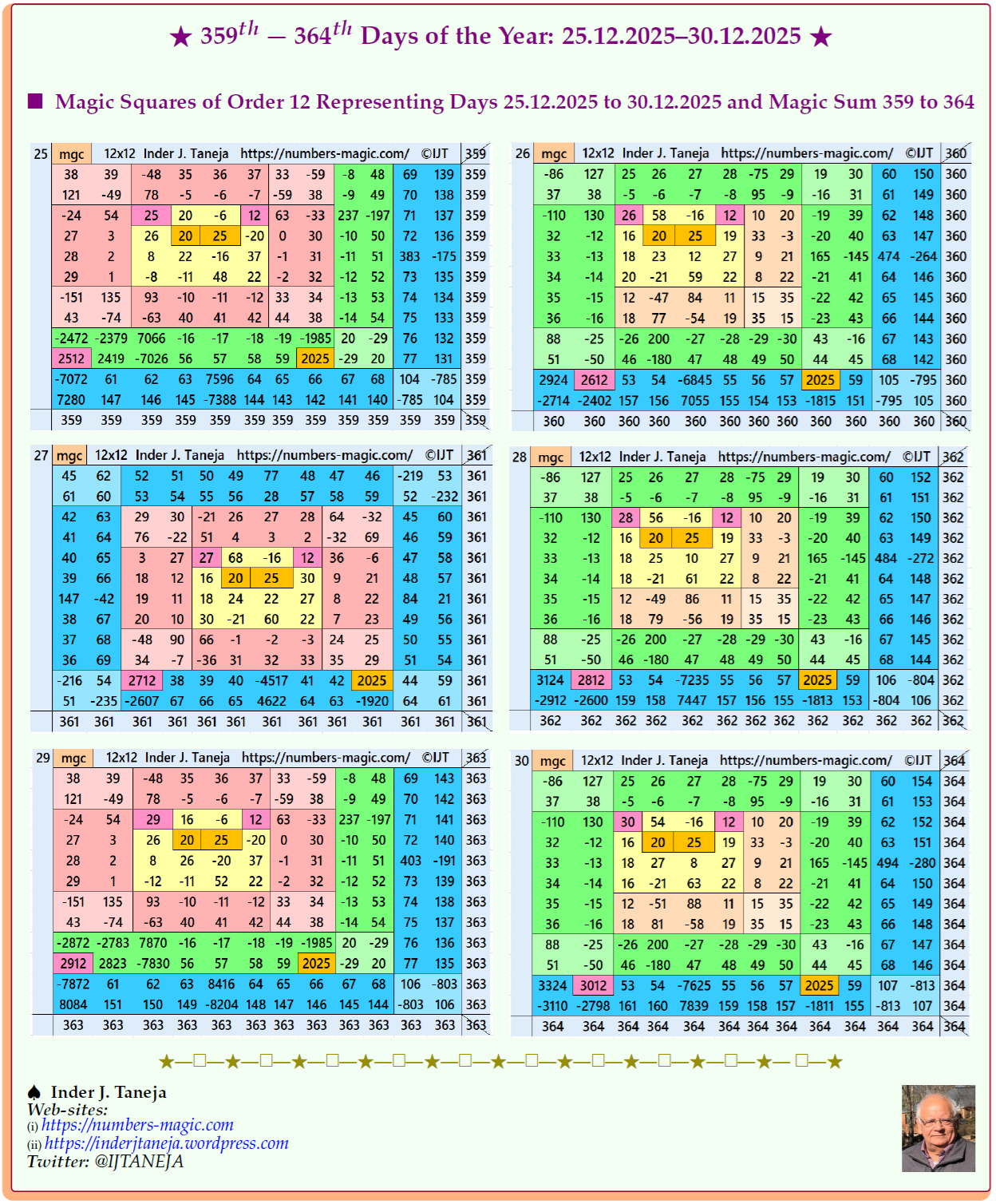5. Inder J. Taneja, Magic Squares of Order 12 Representing Days and Dates of the Year 2025 Zenodo, June 10, 2025, pp. 1-43, https://doi.org/10.5281/zenodo.15631884.