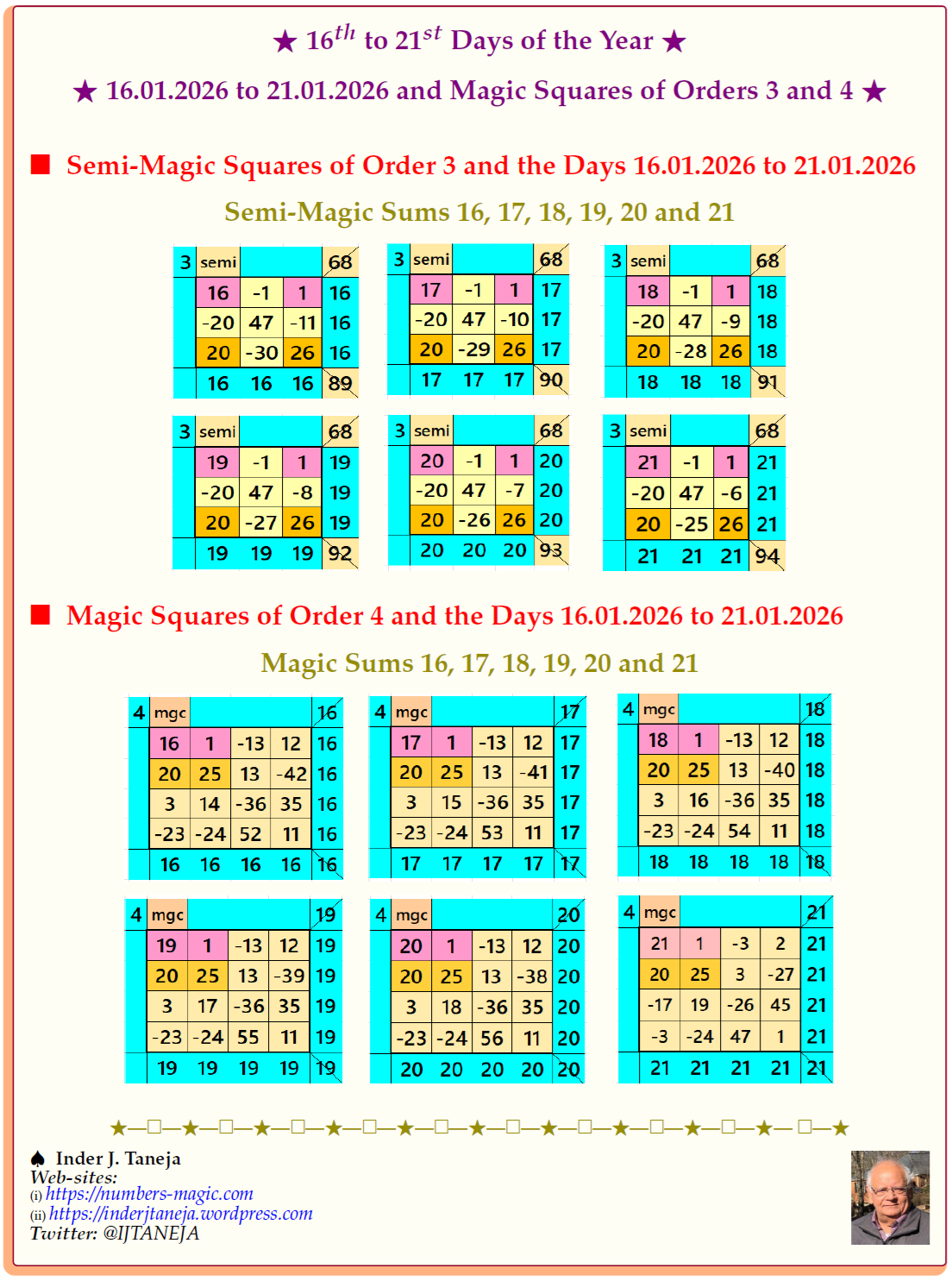 Inder J. Taneja, Magic Squares of Orders 3 to 7 in Representing Dates and Days of the Year 2025, Zenodo, May 04, 2025, pp. 1-474, https://doi.org/10.5281/zenodo.15338142.