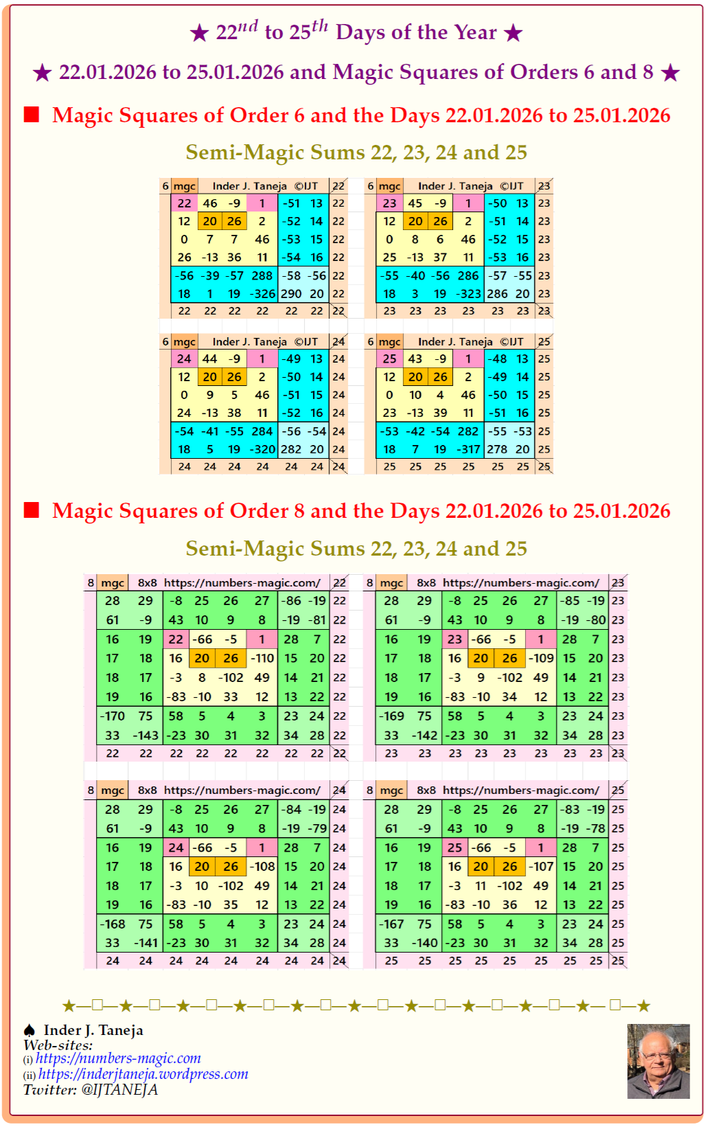 Inder J. Taneja, Magic Squares of Orders 3 to 7 in Representing Dates and Days of the Year 2025, Zenodo, May 04, 2025, pp. 1-474, https://doi.org/10.5281/zenodo.15338142.