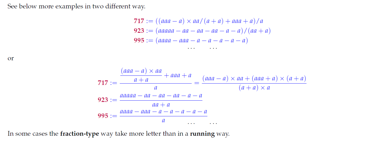 - Inder J. Taneja, Fraction-Type Single Letter Representations of Natural Numbers From 1 to 11111, Zenodo, February 4, 2019, pp. 1-203, http://doi.org/10.5281/zenodo.2556902.