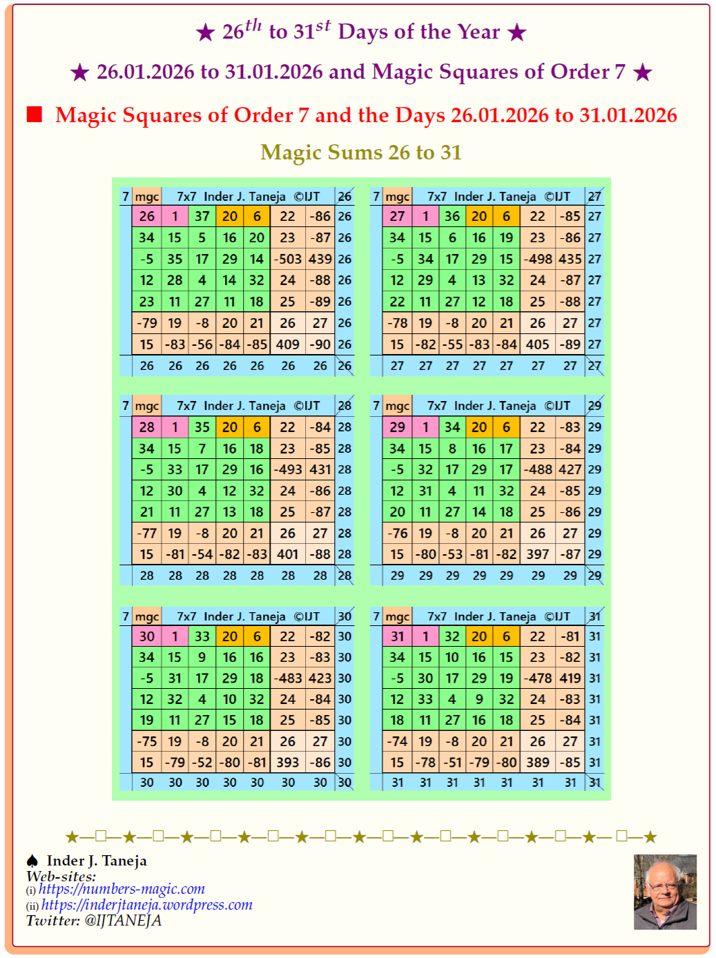 Inder J. Taneja, Magic Squares of Orders 3 to 7 in Representing Dates and Days of the Year 2025, Zenodo, May 04, 2025, pp. 1-474, https://doi.org/10.5281/zenodo.15338142.