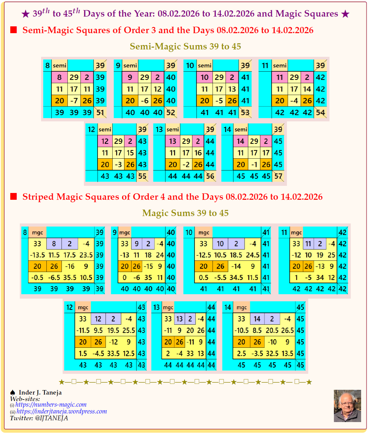 Inder J. Taneja, Magic Squares of Orders 3 to 7 in Representing Dates and Days of the Year 2025, Zenodo, May 04, 2025, pp. 1-474, https://doi.org/10.5281/zenodo.15338142.