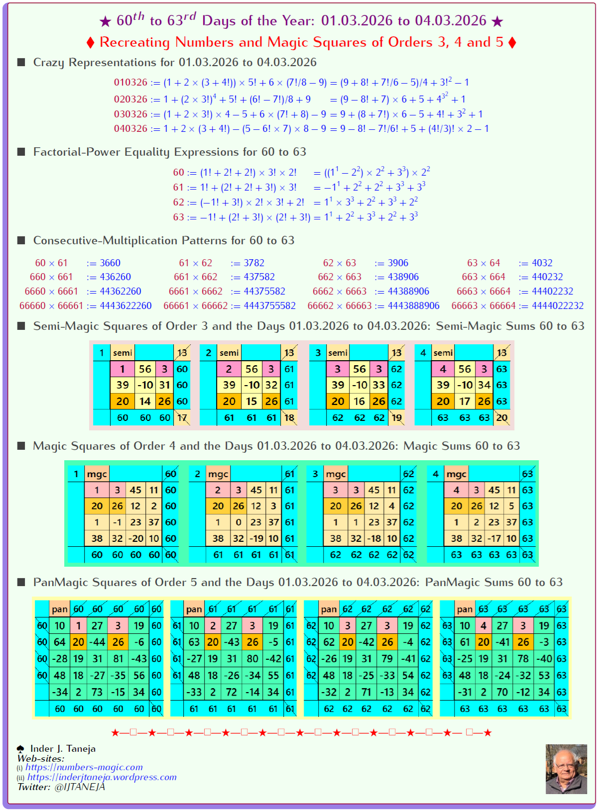 Inder J. Taneja, Magic Squares of Orders 3 to 7 in Representing Dates and Days of the Year 2025, Zenodo, May 04, 2025, pp. 1-474, https://doi.org/10.5281/zenodo.15338142.