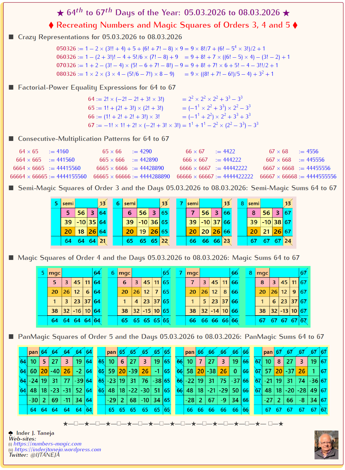 Inder J. Taneja, Magic Squares of Orders 3 to 7 in Representing Dates and Days of the Year 2025, Zenodo, May 04, 2025, pp. 1-474, https://doi.org/10.5281/zenodo.15338142.