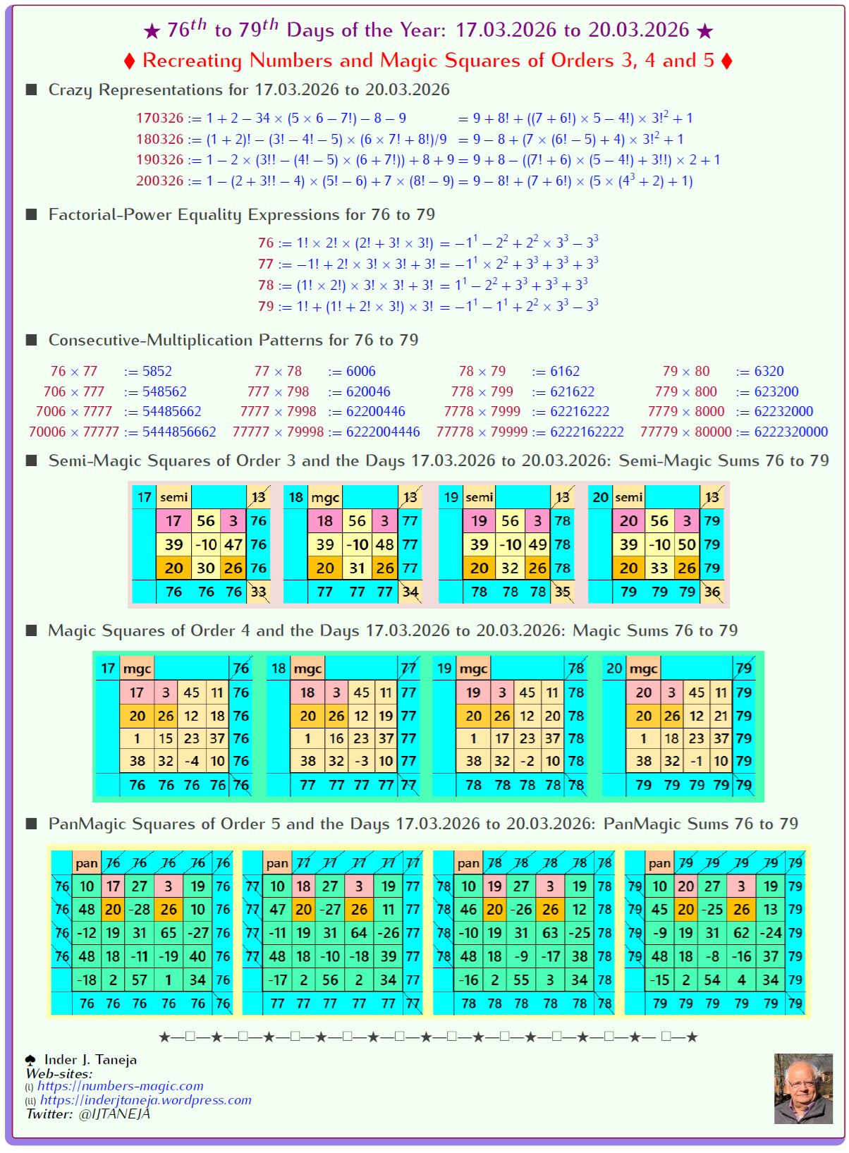 Inder J. Taneja, Magic Squares of Orders 3 to 7 in Representing Dates and Days of the Year 2025, Zenodo, May 04, 2025, pp. 1-474, https://doi.org/10.5281/zenodo.15338142.