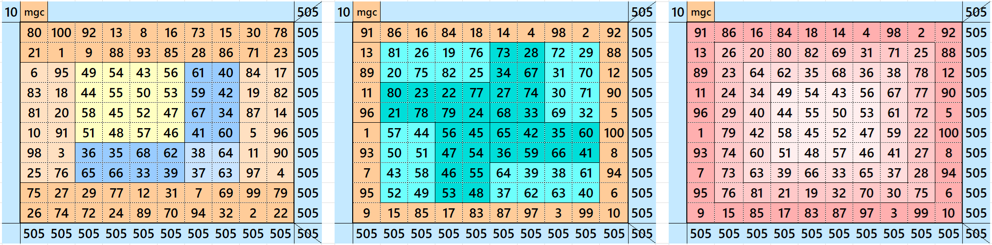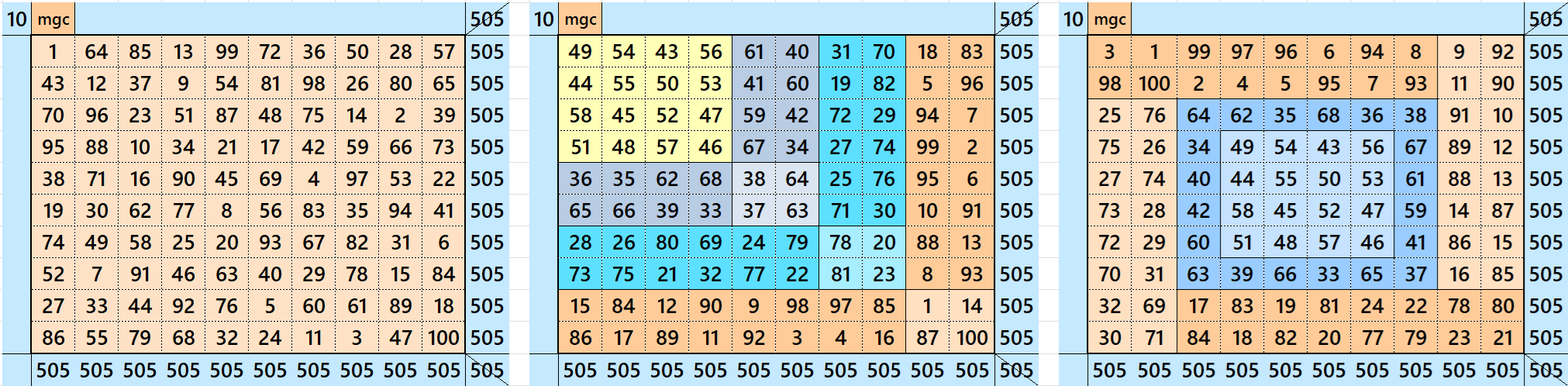 - The fifth one is again a single-digit bordered magic square of order 10 embedded with a striped magic square of order 8 composed 4 equal sums magic squares of order 4 or 8 equal sums magic rectangles of order 2×4.