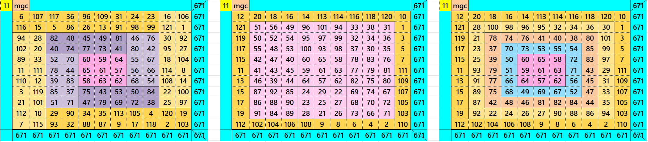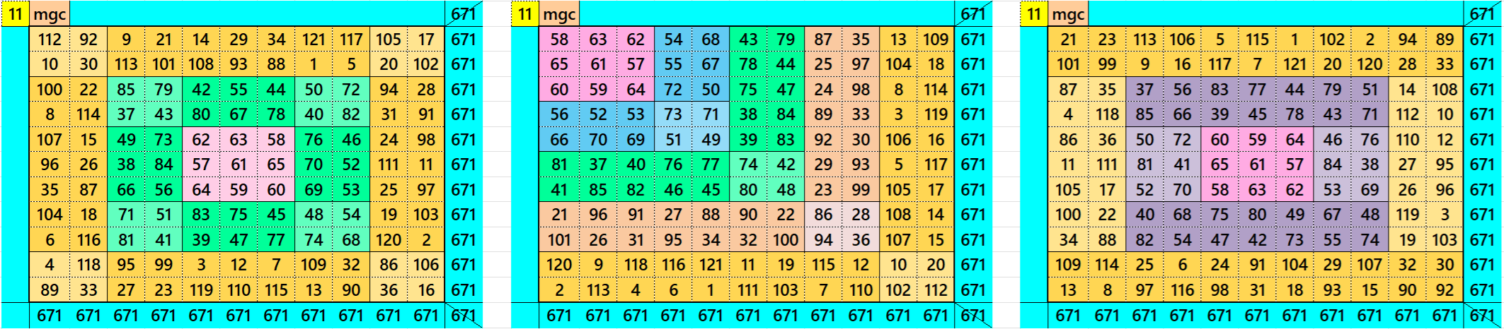 - First one is a double-layer bordered magic square of order 11 with magic square of order 3 is in the middle. The 4 magic rectangles of orders 2×3 and 4 magic rectangles of order 2×7 are of equal magic sums in each case.